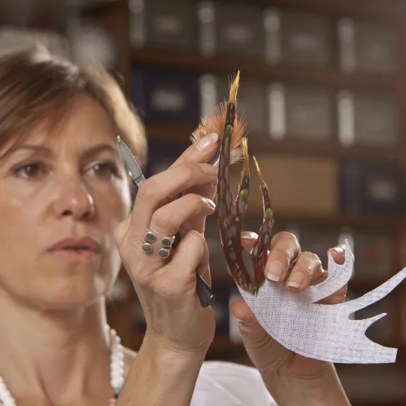 NS. J’exerce un métier très ancien puisque les statuts des premiers maîtres plumassiers ont été octroyés en 1599 par Henri IV. Ma mission a été de défendre ce métier en voie de disparition ; redorer l’image de l’art de la plume, faire vivre ces savoir-faire et les transmettre aux nouvelles générations. Depuis plus de 30 ans, je façonne et transforme les plumes en les adaptant à mon imaginaire et à une esthétique contemporaine. Je pars d’une plume (d’oie, de faisan doré, de colvert, de perdrix, de geai des jardins...) et je crée des effets en aplat ou en relief, adaptés au sujet et composés selon leurs couleurs et leur plasticité. Ma connaissance de la matière et des techniques nourrit ma créativité pour créer un décor, une parure ou développer une œuvre artistique.