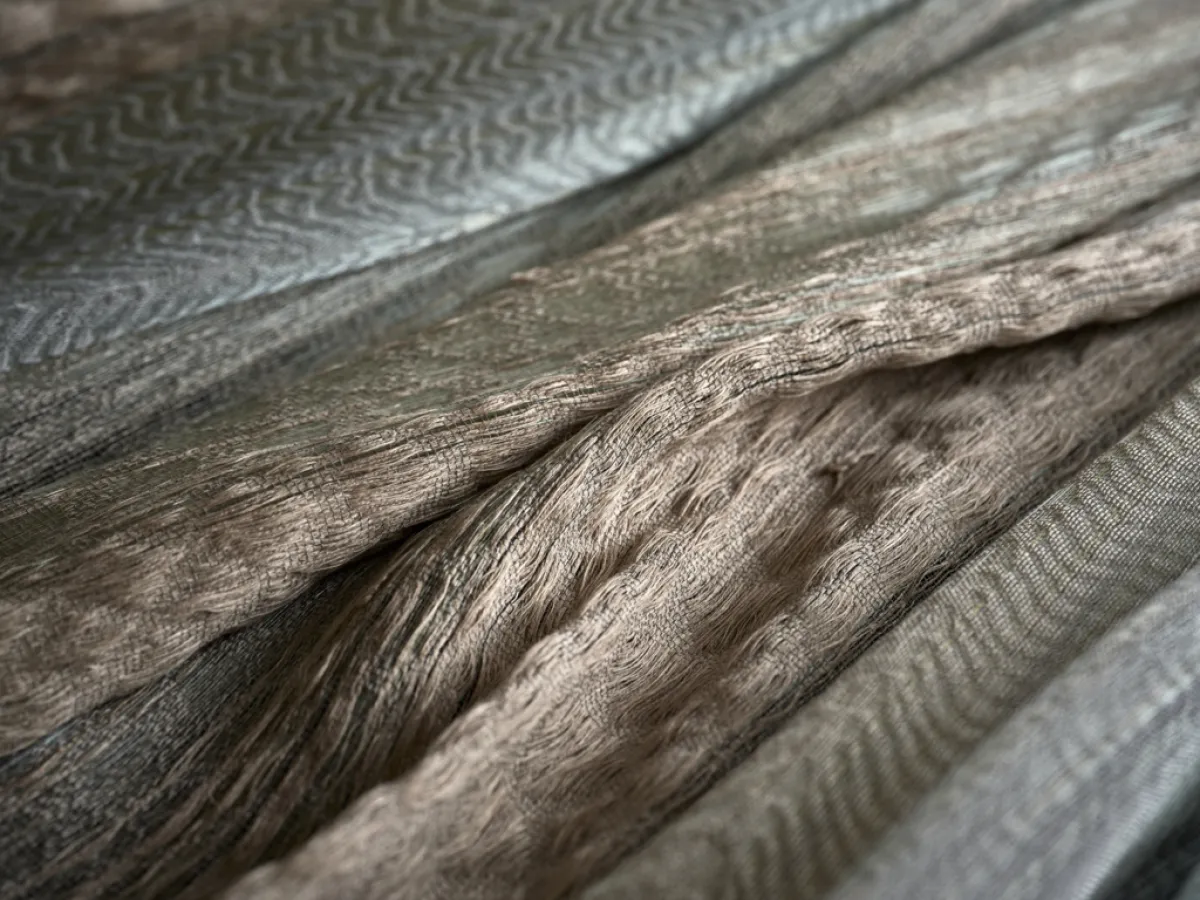The primary material used to create Pêche cristalline is Glaz, a marine glass developed by Lucile Viaud in tribute to the chef and his region. Crafted from abalone shells and micro-algae, it was melted and then worked at high temperatures to produce kilometers-long glass filaments. The duo then wove the filaments through with linen on Aurélia Leblanc's semi-electronic loom, utilizing a pattern generated by software from an original physical drawing, to create a long iridescent drapery of several meters.