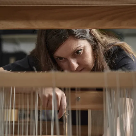 A weaver trained at the Royal Academy of Fine Arts in Brussels, Aurélia Leblanc has established herself in her field by mastering various artisanal skills, including weaving, printmaking, screen printing, and embroidery. She has done both manual weaving and worked on an artisanal scale in her flagship workshop, continually experimenting with different fibers and techniques in a pursuit of technical, ethical, and ecological innovation. She met designer Lucile Viaud at the Ateliers de Paris. Both were laureates of the Grand Prix de la Création de la Ville de Paris. The duo teamed up to collaborate with incredible common goal: weaving glass.