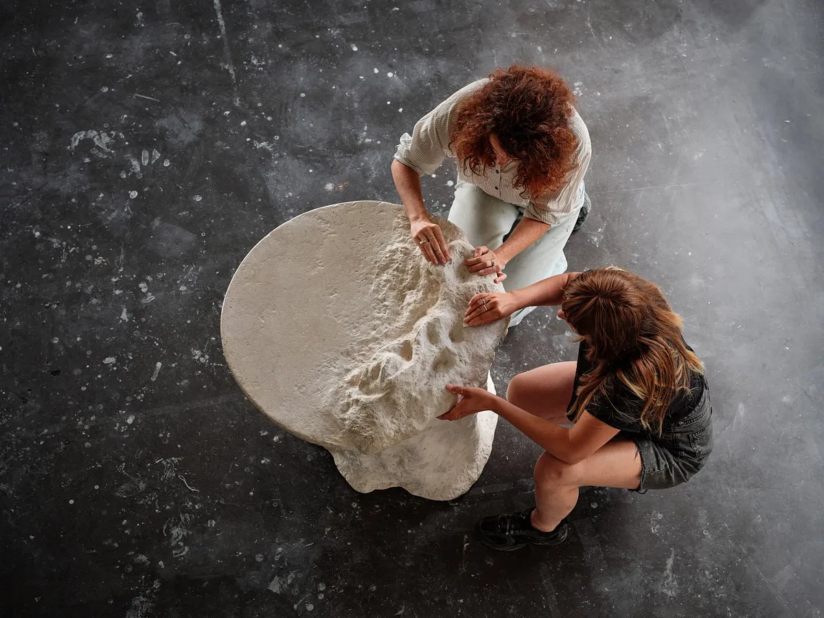 They drew inspiration from the Loire Valley’s tufa stone to create Tufo, a coffee table that seems to have just emerged from a block of stone, embodying the work in progress with a unique, powerful aesthetic. The pair combined this rare creative gesture with ambitious innovation. Contrary to appearances, the table is not in tufa but Leatherstone©, a new material made of leather scraps mixed with a natural, biodegradable binder free of petrochemicals.