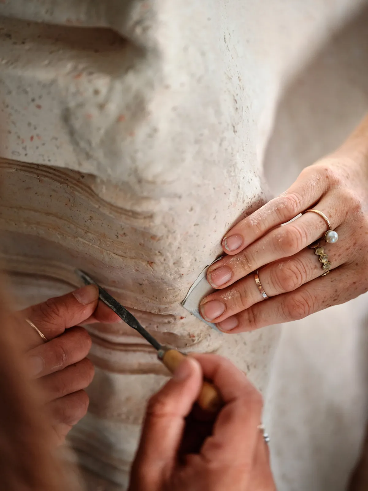 Leatherstone© uses traditional modelling techniques, as it is worked when the material is ductile (still soft). After drying, it gets very hard and can be worked like stone, a technique Elodie and Rebecca are exploring with undeniable success.