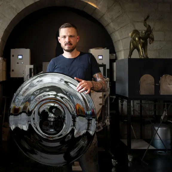 The powerful yet poetic work carries a universal message. "I wanted this wall constellation of fifteen juxtaposed cives forming a circular magma to express the symbol of original matter," says Mr. Wintrebert. The work attests to his absolute technical mastery. He fuses his own glass, pursuing a journey into the heart of the material in search of the perfect form, which requires precision down to the millimeter.