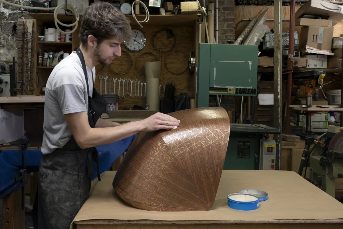 Each of its three parts required the team to push traditional techniques to the limit. The hull, a perfect combination of classic craftsmanship and cutting-edge technology, is made from a briquetted blank tooled with digital control. The curved junction between the legs and the hull is entirely handmade and the whole is completed with a fine copper weave. The stern was built in three sectors combining folded and solid walnut. The sail is made of solid walnut stretching a fabric of wires.