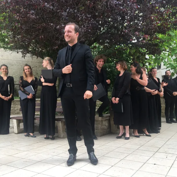 Mathieu Romano travaille tout autant avec le chœur a cappella qu’avec l’orchestre. Formé à la direction d’orchestre au Conservatoire National Supérieur de Musique de Paris, il aborde tous les genres, de la musique baroque à la création contemporaine, en concert et à l’opéra. Il a notamment dirigé le RIAS Kammerchor, l’Orchestre Français des Jeunes ou encore Les Siècles. Il a également dirigé des productions d’opéras avec les Frivolités Parisiennes et des projets contemporains avec l’Ensemble Itinéraire.