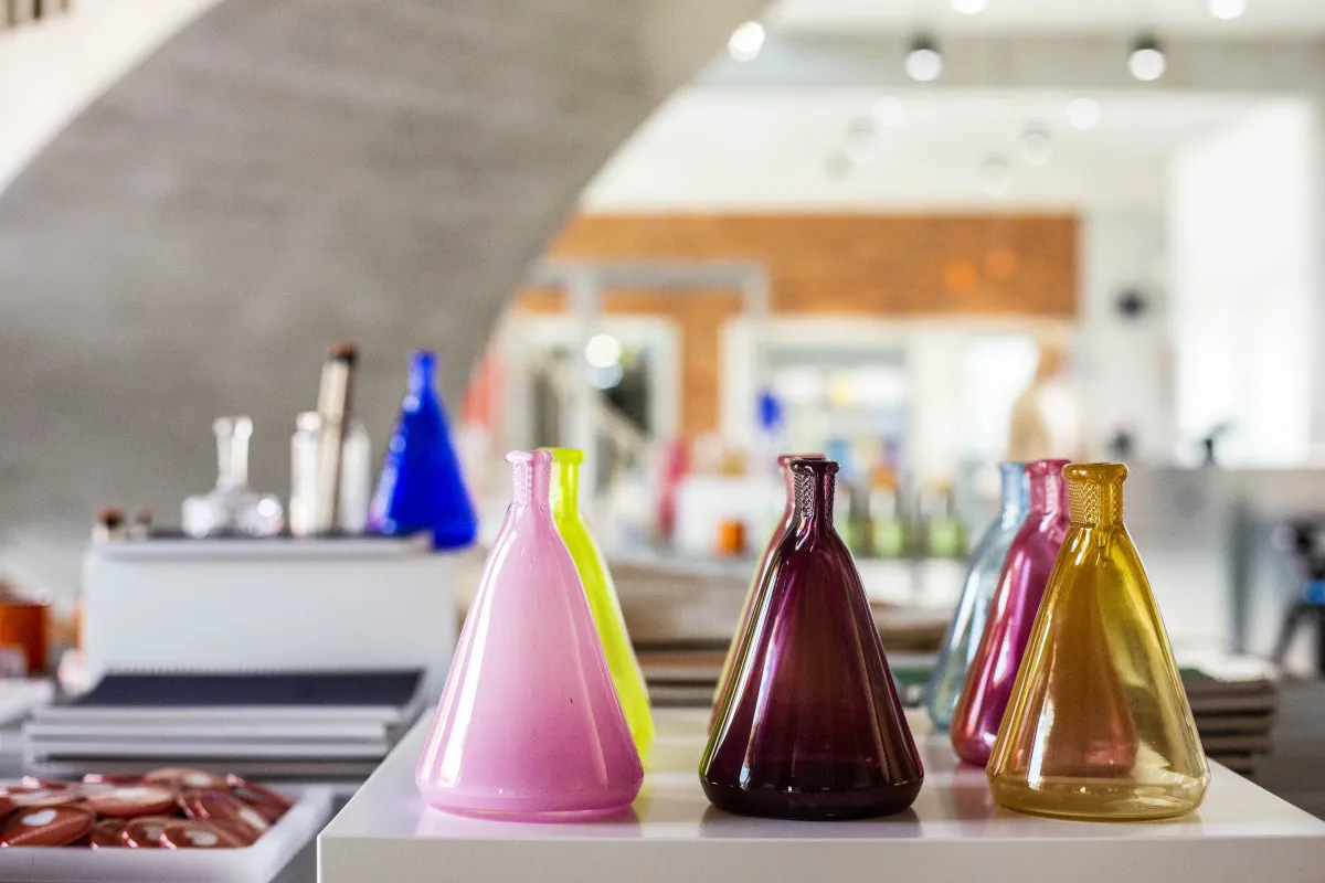 L’artiste François Daireaux a produit ici la série « Blow Bangles », fusionnant les techniques des verreries de Firozabad en Inde et celles de Meisenthal. Le designer François Azambourg y a conçu des pièces uniques, comme le désormais mythique vase Douglas. Accueilli en résidence, le designer Nicolas Verschaeve a réinterrogé la technique du soufflage au moule, créant un ensemble d’œuvres qui font aujourd’hui l’objet d’une exposition.