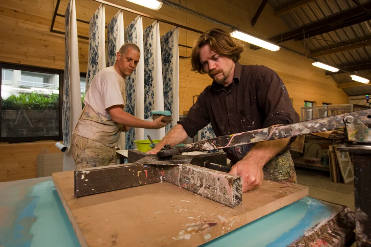 « Après ma formation aux Beaux-Arts d’Angers, j’ai participé à une expérience pédagogique autour de la revalorisation des métiers d’art. La ville souhaitait un plasticien pour créer un atelier de papiers peints à la planche. J’ai répondu à la demande sans vraiment connaître le domaine mais j’ai joué le jeu. Et me suis plongé dans cet univers fascinant ! Après une année d’enseignement et un passage en entreprise, j’ai décidé de me lancer seul.