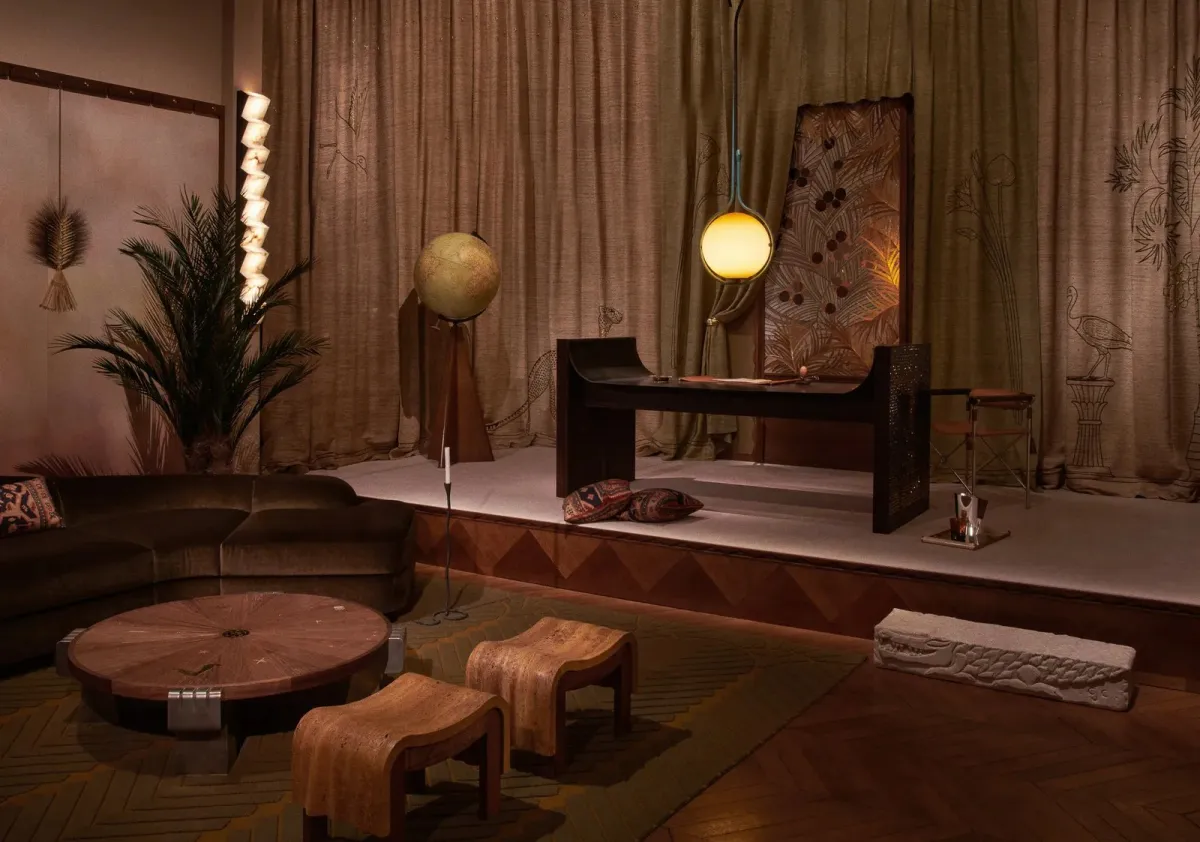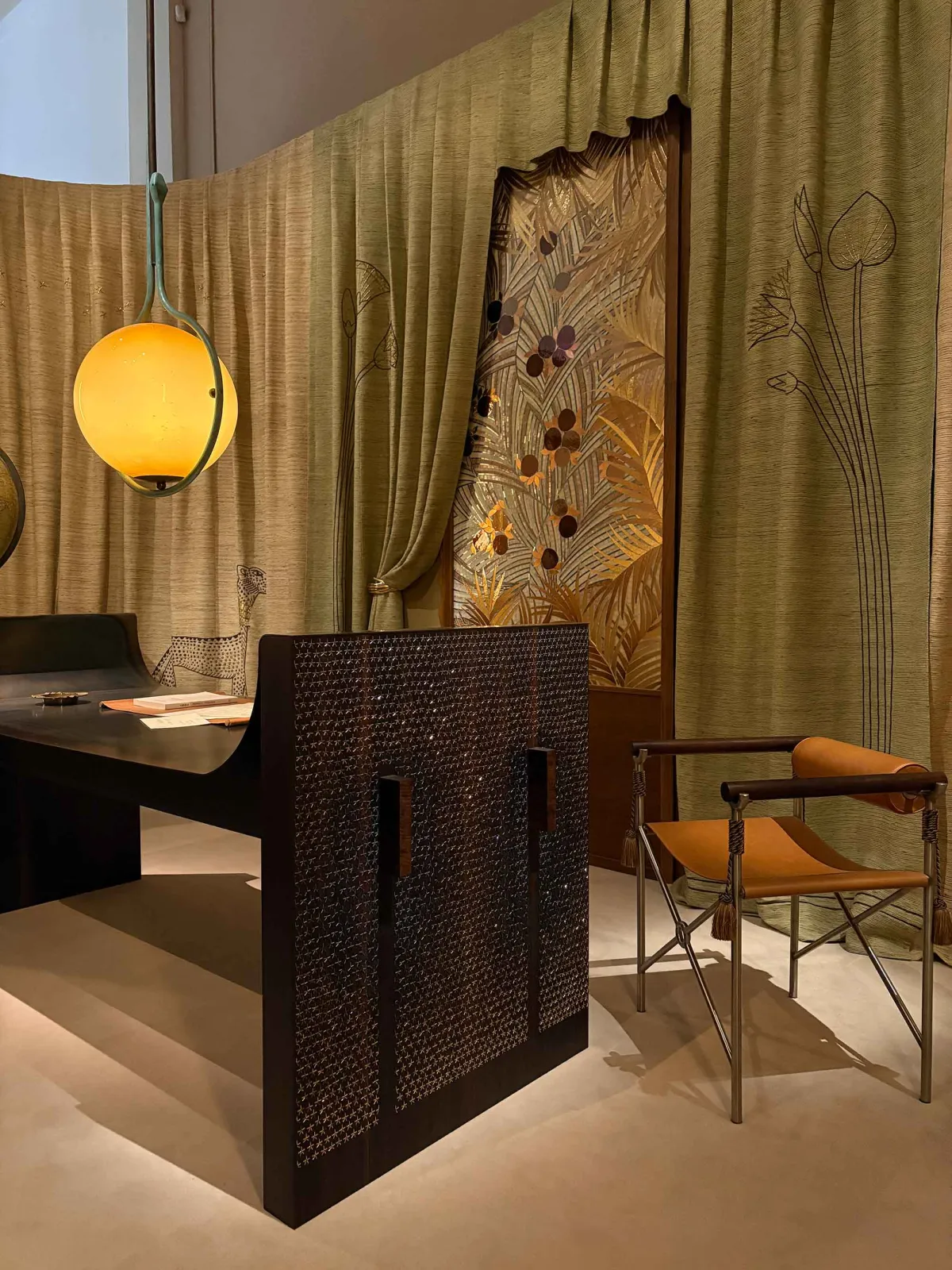 Célébrant un imaginaire anglo-caraïbéen, le duo de designers Dach & Zéphir a redessiné un vestibule dans des tonalités ocre, orangé, terracotta et autres couleurs de la région. Ici, la flore omniprésente (graines, fleurs de bananier, bois exotique) invite à savourer l’attente comme un moment suspendu, dans une évocation des îles et de leur douceur de vivre. Convoquant cette fois l’histoire autant que la géographie, l’agence Oud Architecture, fondée par Marie-Sarah Bucket et Josselin Berthelot, a imaginé le bureau idéal d’un ambassadeur, posé sur les rives du Nil. Un espace éminemment poétique, relayé par des objets porteurs de mythes et de superstitions. Une table ronde ébauchait une carte du ciel, un canapé évoquait la silhouette d’un crocodile, un bureau convoquait la figure sacrée du scarabée. Fruit d’une collaboration entre le studio Oud et l’atelier de Jean-Brieuc Chevalier, lauréat 2025 du Prix Liliane Bettencourt pour l’Intelligence de la Main®, ce bureau exprimait le meilleur d’un savoir-faire unique, la broderie sur bois, ici rehaussée de perles pour former un motif de l’Egypte antique. Ebéniste d’exception, Jean-Brieuc Chevalier a également participé à la création de la table basse dont la marqueterie s’orne de délicates incrustations.