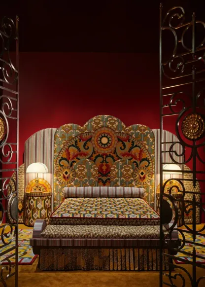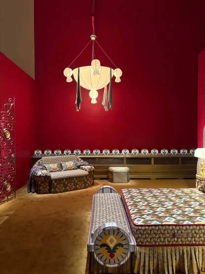 Inspiré par le réemploi et la transformation, Paul Bonlarron a imaginé la pièce suivante, une salle à manger pleine de fantaisie où l’évocation de restes culinaires se faisait décor avec ces luminaires en forme de pain, ces assiettes en émail de coquille d’œuf ou ces nappes teintes à partir de pelures d’oignon réalisées par l’artisane Mélanie Viard. Tout aussi spectaculaire, l’ultime espace prenait la forme d’une chambre présidentielle, conçue par l’artiste designer Pierre Marie qui a choisi de placer le lit au centre de sa scénographie, avec sa tête, ses chevets et ses lampes. Celui-ci était recouvert d’un tissu signé du designer et inspiré des couleurs emblématiques de la République, le tout rehaussé de plissages réalisés par les ateliers Lognon. L’ensemble baignait dans une tonalité développée avec la manufacture Malouinières, rappelant la nuance cramoisie qui signe les lieux de pouvoir.