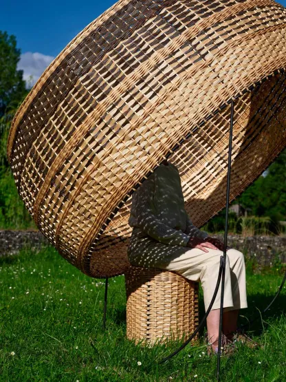 Célébrant la collaboration entre artisanat d’art et design, Dialogues récompense cette année le fruit du travail de Catherine Romand, vannière depuis plus de 40 ans, et Clémence Althabegoïty, diplômée de la Design Academy d’Eindhoven et des Beaux-Arts de Paris. Cette rencontre mêlant vannerie, design et science a permis la création d’une œuvre futuriste et poétique, Tresser l’ombre, une ombrière tressée en osier qui permet de se protéger du soleil tout en faisant office de cadran solaire immersif.