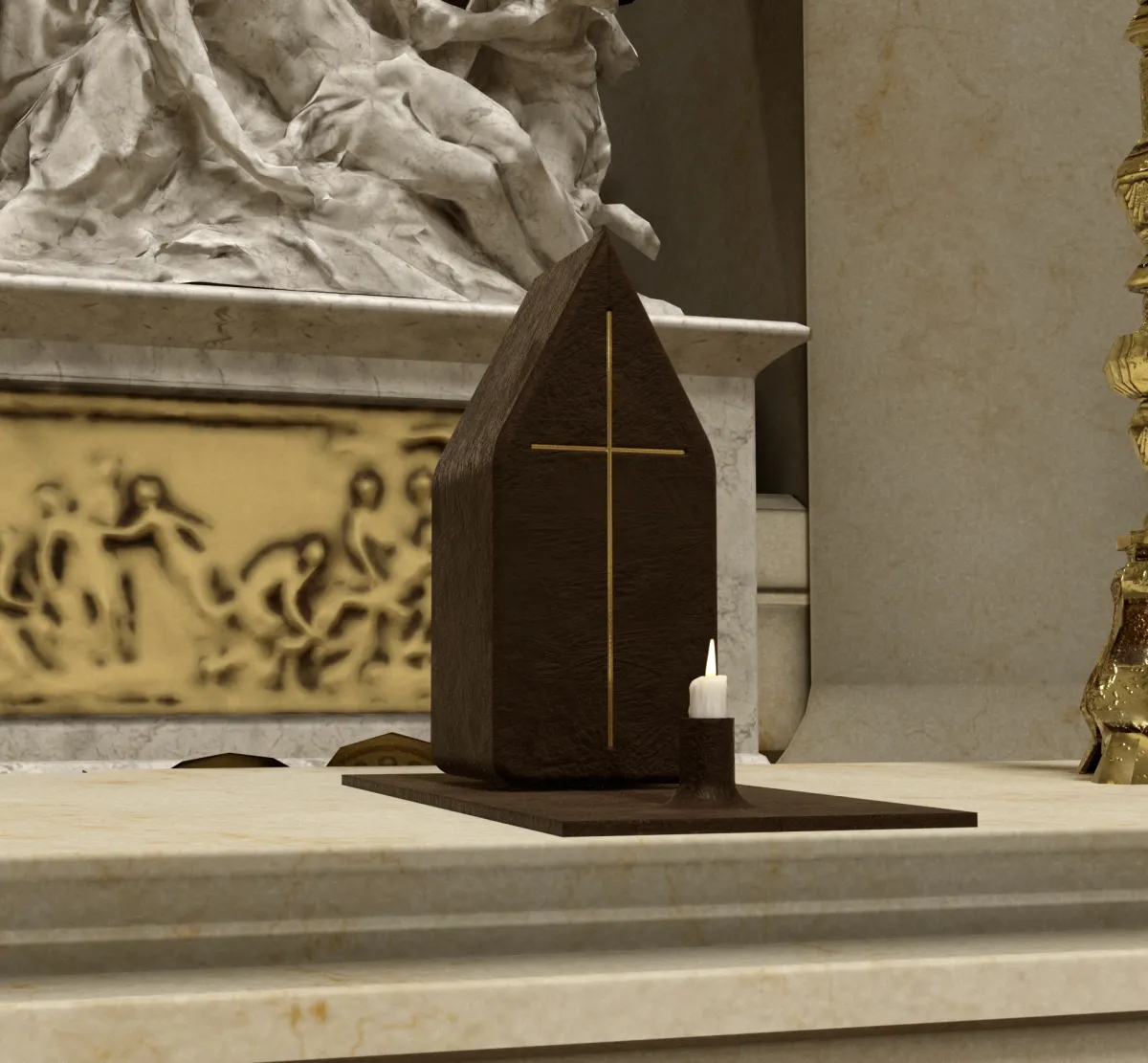 Celui-ci sera posé sur l’ancien autel de Viollet-le-Duc, entouré de sculptures baroques qui constituent un environnement très chargé. J’ai choisi la simplicité en revenant à l’étymologie du mot tabernacle, « la tente ». Je l’ai conçu comme une petite maison en bronze gravé d’une croix dorée avec, devant, une bougie toujours allumée (en l’occurrence un Led). Elle s’ouvrira comme un livre, dévoilant une lumière révélée par le bronze poli miroir. Symbole de la présence lumineuse du Christ, avec le ciboire qui contient les hosties consacrées.