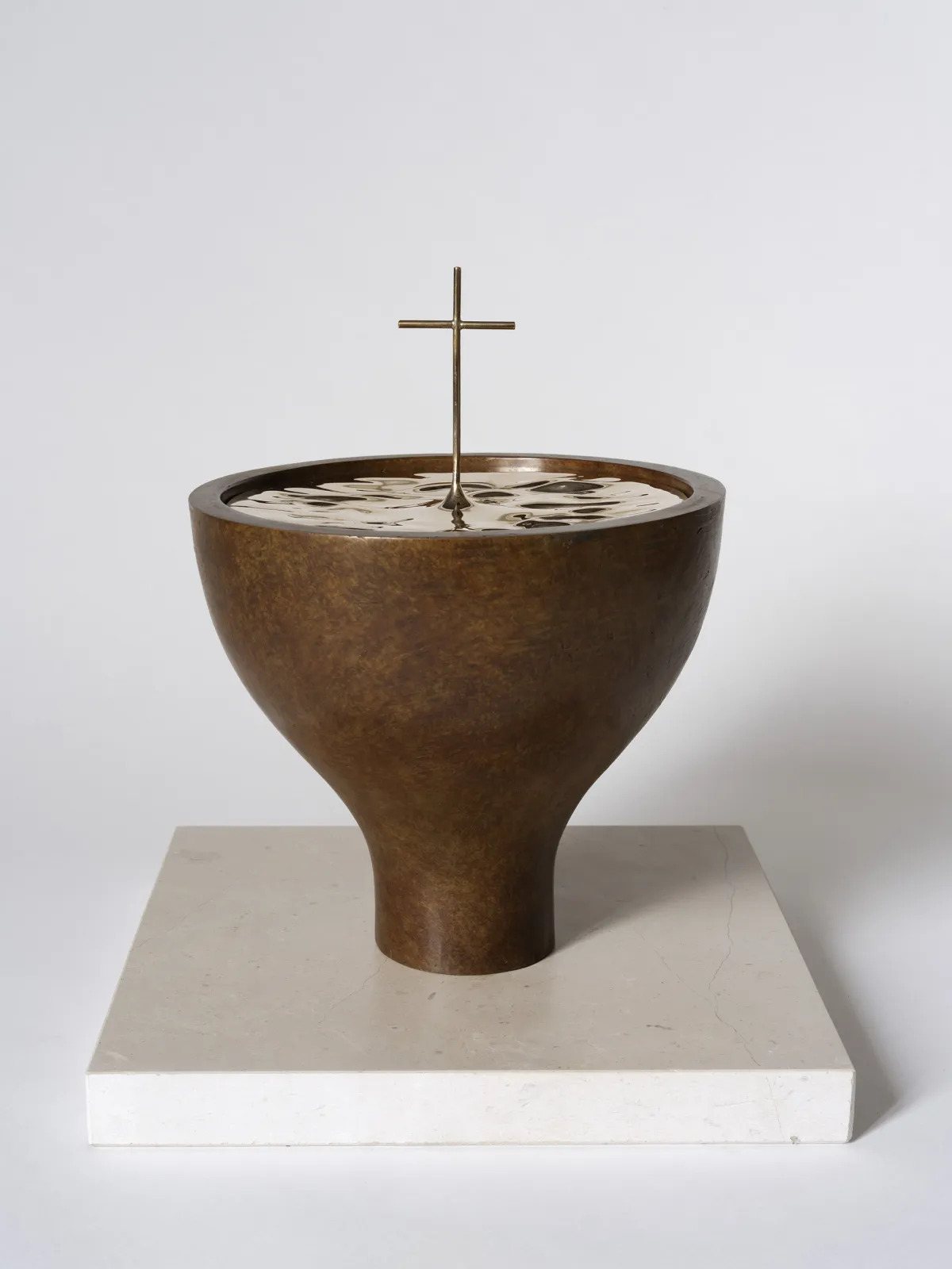 Ma démarche s’est poursuivie dans cette volonté de simplicité, la quête du « juste nécessaire ». Cette pièce était très intéressante car il n’existait pas de baptistère fixe à Notre-Dame. Le cahier des charges offrait donc une certaine liberté, tout en imposant la présence d’un couvercle pour protéger l’eau sacrée. Comment faire pour que celui-ci n’occulte pas la symbolique du baptême ? J’ai résolu la question en imaginant un couvercle en bronze poli miroir qui représente les clapotis d’une rivière d’où surgit la croix du baptême. La forme circulaire est très simple, comme un calice ou un ciboire. Une forme qui vient de la nuit des temps…