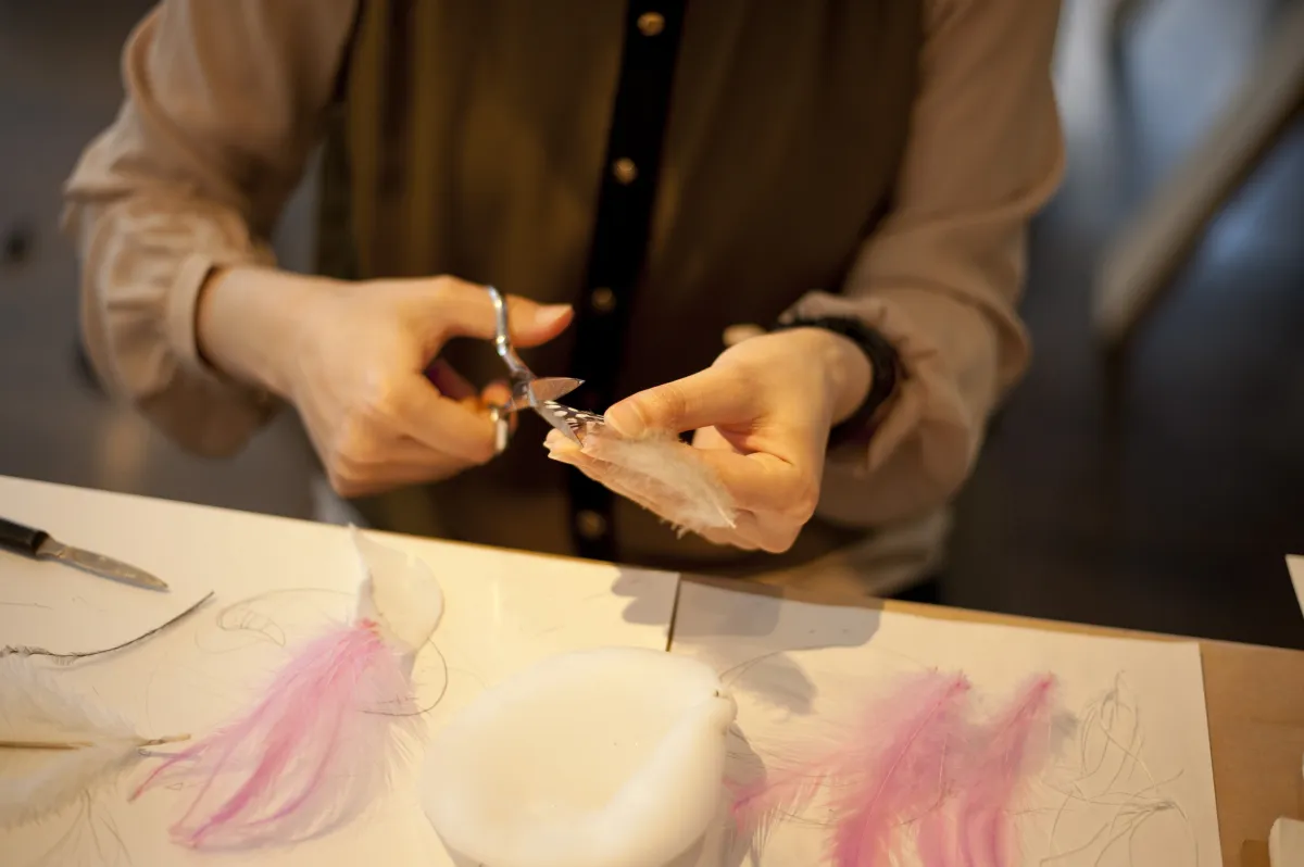 NS. J’exerce un métier très ancien puisque les statuts des premiers maîtres plumassiers ont été octroyés en 1599 par Henri IV. Ma mission a été de défendre ce métier en voie de disparition ; redorer l’image de l’art de la plume, faire vivre ces savoir-faire et les transmettre aux nouvelles générations. Depuis plus de 30 ans, je façonne et transforme les plumes en les adaptant à mon imaginaire et à une esthétique contemporaine. Je pars d’une plume (d’oie, de faisan doré, de colvert, de perdrix, de geai des jardins...) et je crée des effets en aplat ou en relief, adaptés au sujet et composés selon leurs couleurs et leur plasticité. Ma connaissance de la matière et des techniques nourrit ma créativité pour créer un décor, une parure ou développer une œuvre artistique.