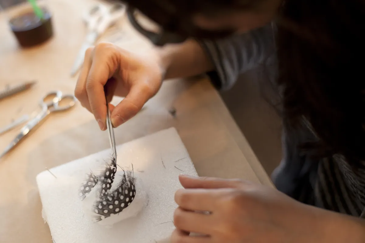 Nelly Saunier. J’ai découvert le monde de la plume à l’âge de 14 ans. Le déclic s’est produit lors de la découverte du métier de plumassière qui m’est apparu comme une évidence, en correspondance parfaite avec mes aptitudes : mon sens de l’observation, mon goût pour l’art... Surtout, il s’accordait avec ma fascination pour les oiseaux, et la nature.