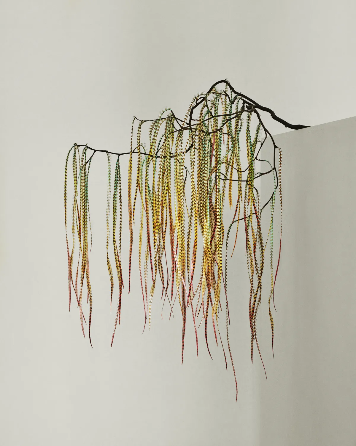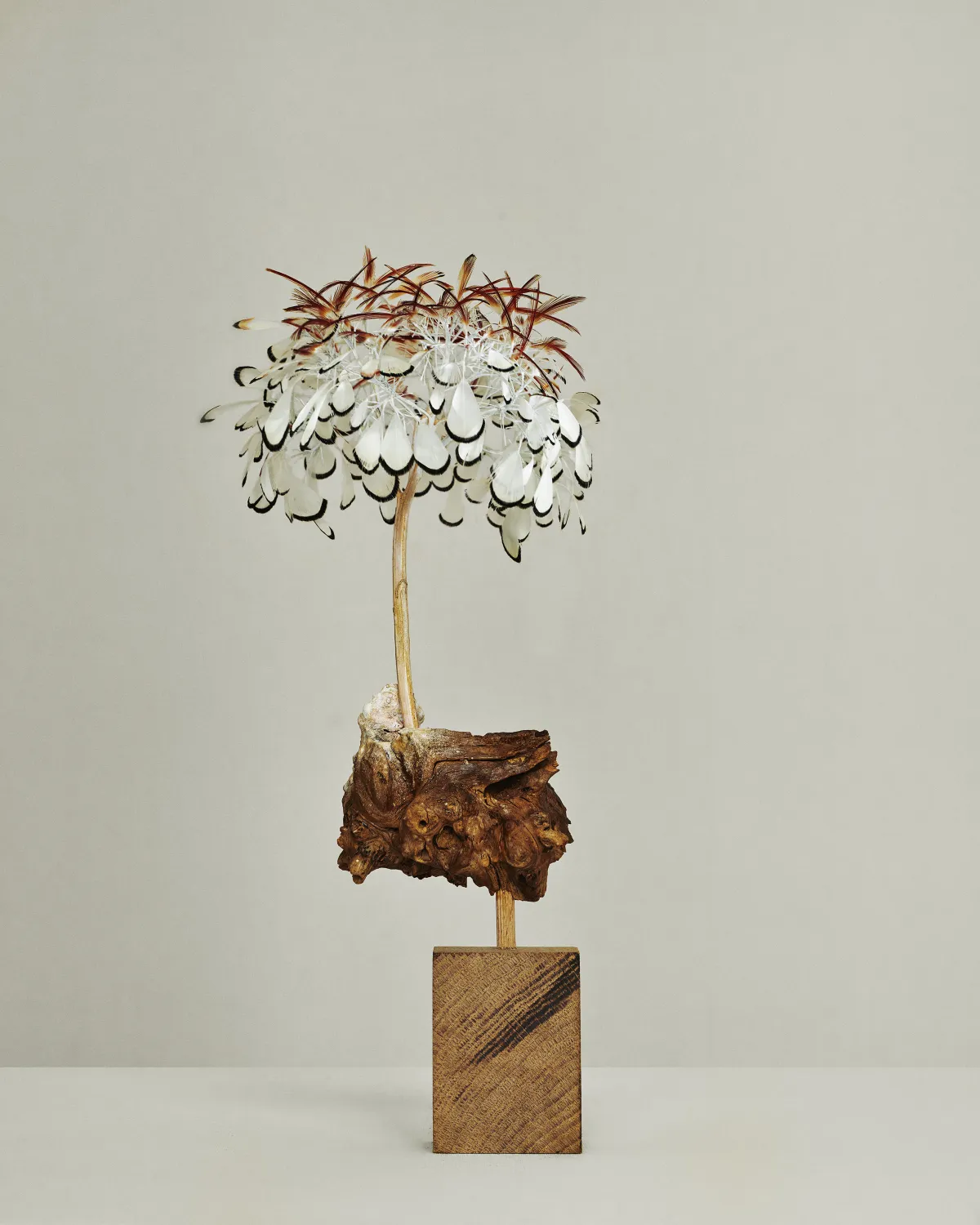 NS. Mon activité s’articule autour de deux pôles. Mes recherches personnelles s’ouvrent sur divers champs d’expérimentation, de l’infiniment petit jusqu’à des pièces monumentales, associant la plume à d’autres matériaux. Je travaille actuellement sur une série baptisée Natures transformées© qui met en lien végétal et animal pour créer des trompe l’œil ; comme ces plumes qui deviennent feuillages ou fleurs, mêlant réalité et illusion. Par ailleurs, je réponds régulièrement à des commandes pour la haute-couture, le design, le cinéma et même la haute joaillerie ; j'ai récemment travaillé avec des plumes de quelques dixièmes de millimètres que j’ai enchâssées pour décorer le cadran d’une montre.