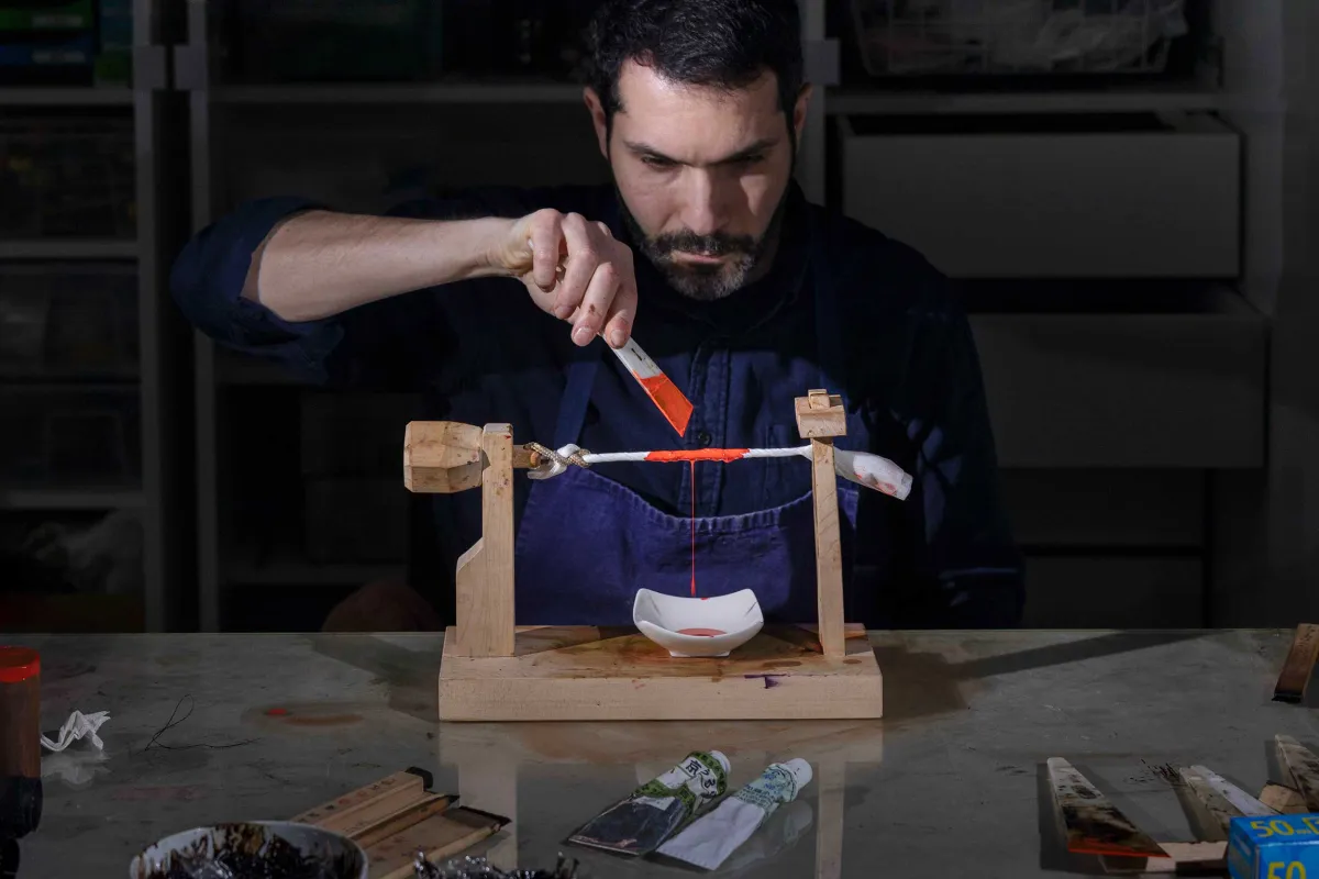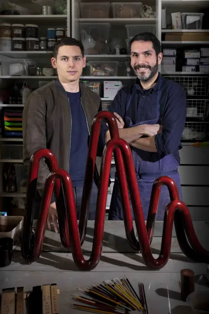 « Depuis mes années de formation, je suis passionné par la laque végétale et mon métier s'articule autour de l’usage et de la transmission de ce savoir-faire ancestral. Formé à l’ébénisterie à l’École Boulle, j’ai eu la chance de me perfectionner au Japon auprès du maître Nagatoshi Onishi, dont l’enseignement a marqué mon approche de la matière et du geste. Indépendant depuis 2009, j’ai ouvert mon atelier à Paris en 2017, un espace dédié à la laque végétale où j’explore les dialogues entre tradition et innovation. En 2024, j’ai eu le privilège de résider à la villa en compagnie de Dimitry Hlinka avec lequel j’ai reçu le Prix pour l’Intelligence de la Main en 2020 pour Entropie, un radiateur couvert d’une laque végétale dont la couleur change selon la température. Notre projet s’est articulé autour des liens entre fibres naturelles et laque végétale, enrichi d’une collaboration avec le laqueur et enseignant-chercheur Kenji Toki. Nous partageons une vision commune de la laque – matériau vivant, porteur de mémoire mais ouvert à l’expérimentation. Ensemble, nous avons exploré les combinaisons entre laque traditionnelle et structures alvéolaires en papier. De cette collaboration est née ASA, une collection d’objets et de mobilier qui incarne l’harmonie entre la légèreté des matériaux et la rigueur du savoir-faire. Cette série sera présentée au salon Révélations, au Grand Palais, du 21 au 25 mai 2025. »