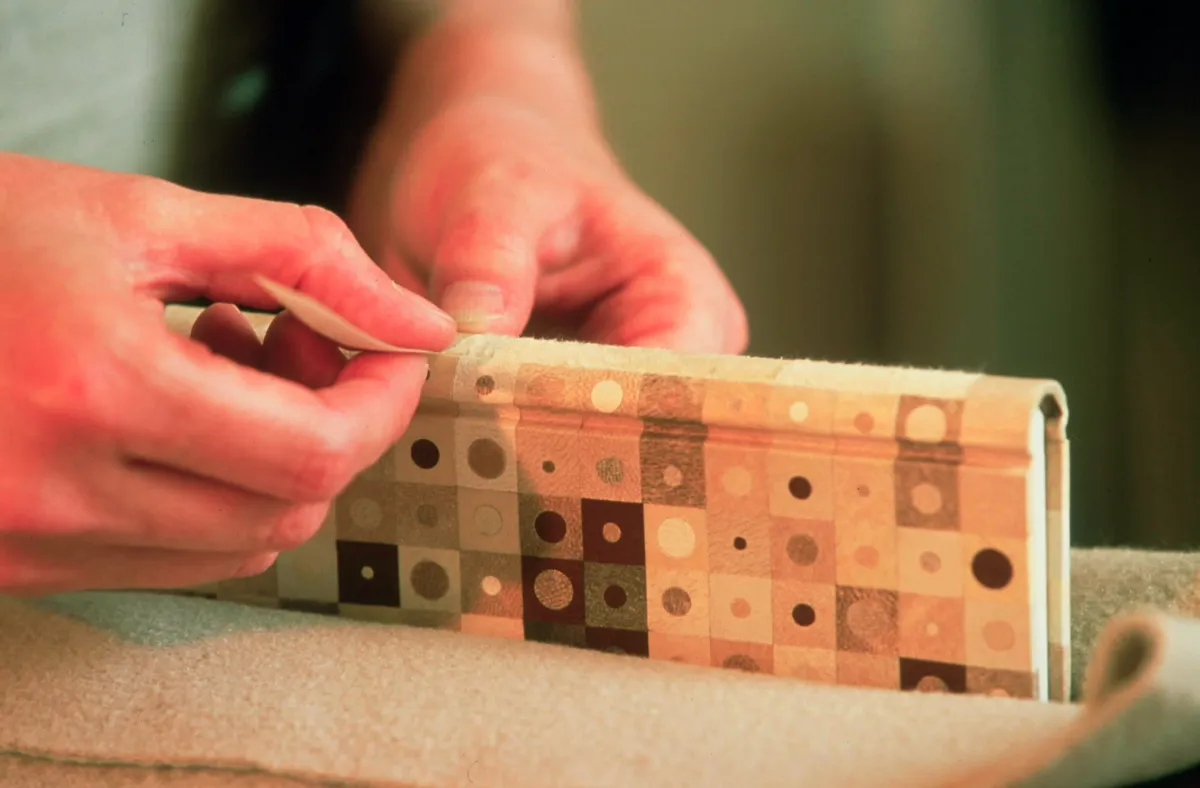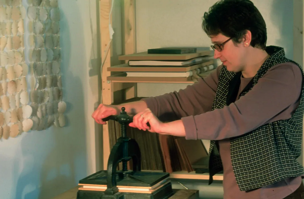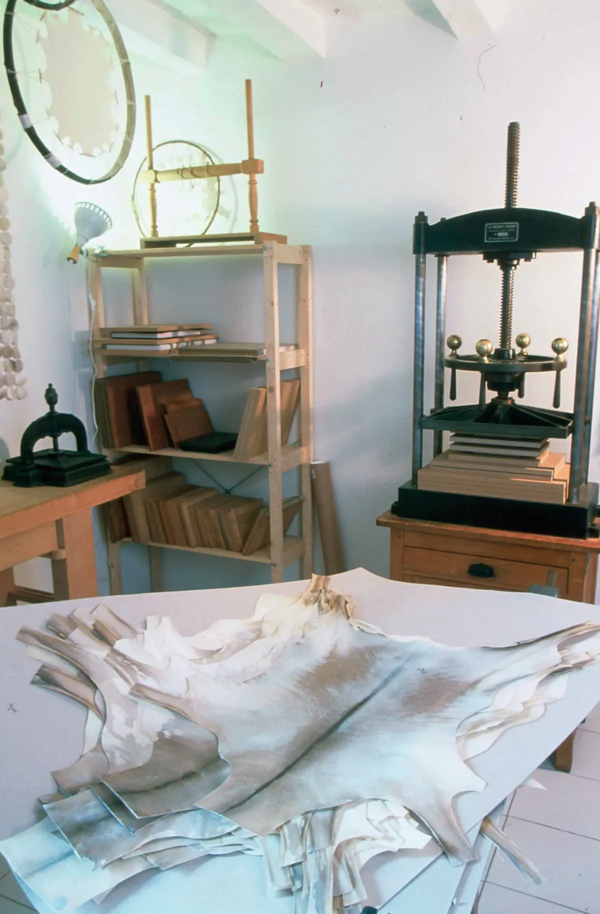 Avec la pièce Continuum Livre, espace infini d’écriture, l’artiste parcheminier offre un nouveau décor au livre en appliquant une technique inédite qu’elle a mise au point, la marqueterie de parchemin : « Au départ, je travaillais des marqueteries de papier que je collais sous le parchemin et je suis passée de là à la marqueterie de parchemin directement en jouant sur les couleurs de la peau. »