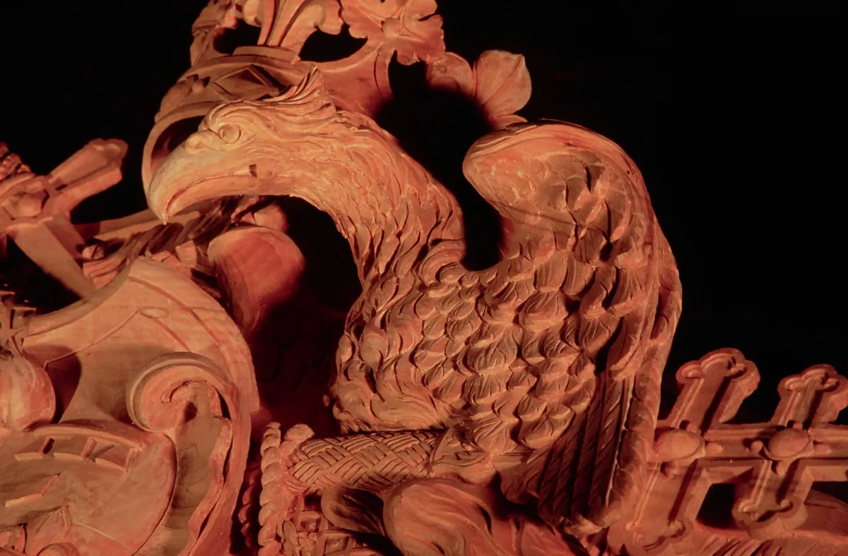 « Une recherche documentaire et l'observation des parties restantes : pointe d'épée, extrémité de crosse, pompons et départ du cartouche, ont permis de recréer le plus fidèlement possible les éléments qui constituaient le fronton d'origine. »