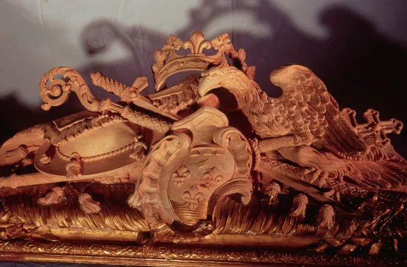 C’est par l’entremise du Getty Museum de Los Angeles aux États-Unis que Bruno Desnoues s’est vu confier la restauration de la traverse haute du cadre du Portrait de Monseigneur Saint-Albin peint par Hyacinthe Rigaud en 1723. Sa riche bordure, oeuvre de l’architecte ébéniste Gilles Marie Oppenord, très endommagée, nécessitait d’être non seulement restaurée mais aussi reconstituée du fait des nombreuses lacunes, en se fondant sur l’étude et l’observation des parties restantes : pointe d'épée, extrémité de crosse, pompons et départ d’un cartouche.