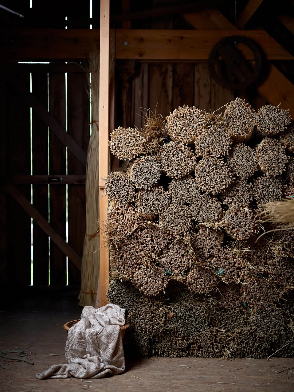 Après la fabrication de la structure métallique, Catherine a commencé le tressage de l’ensemble de la structure dont le côté monumental constitue en soi une véritable prouesse technique – utilisant pour cela un osier cultivé sans pesticide dans son propre champ, récolté et traité de la façon la plus vertueuse, à l’aide d’une simple huile de lin. Autre défi, ce tressage a été réalisé en suivant une inclinaison bien précise déterminée selon la latitude exacte du lieu et un dégradé de couleurs tout aussi exigeant pour le repérage des saisons, allant d’un osier blanc (sans écorce) pour l’hiver jusqu’à un osier brut au brun très foncé pour symboliser l’été. Le tout assorti de torches (des tressages horizontaux) qui symbolisent les dates-clés de l’année – équinoxes, solstices d’hiver et d’été.