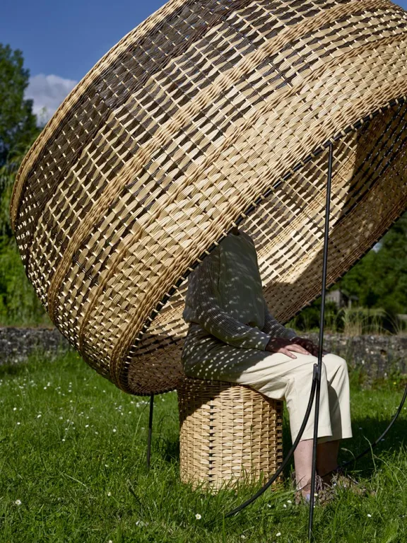 Avec cette ombrière tressée en osier, la vannière Catherine Romand et la designeuse Clémence Althabegoïty ont uni leur savoir-faire pour imaginer un objet aussi futuriste que poétique.