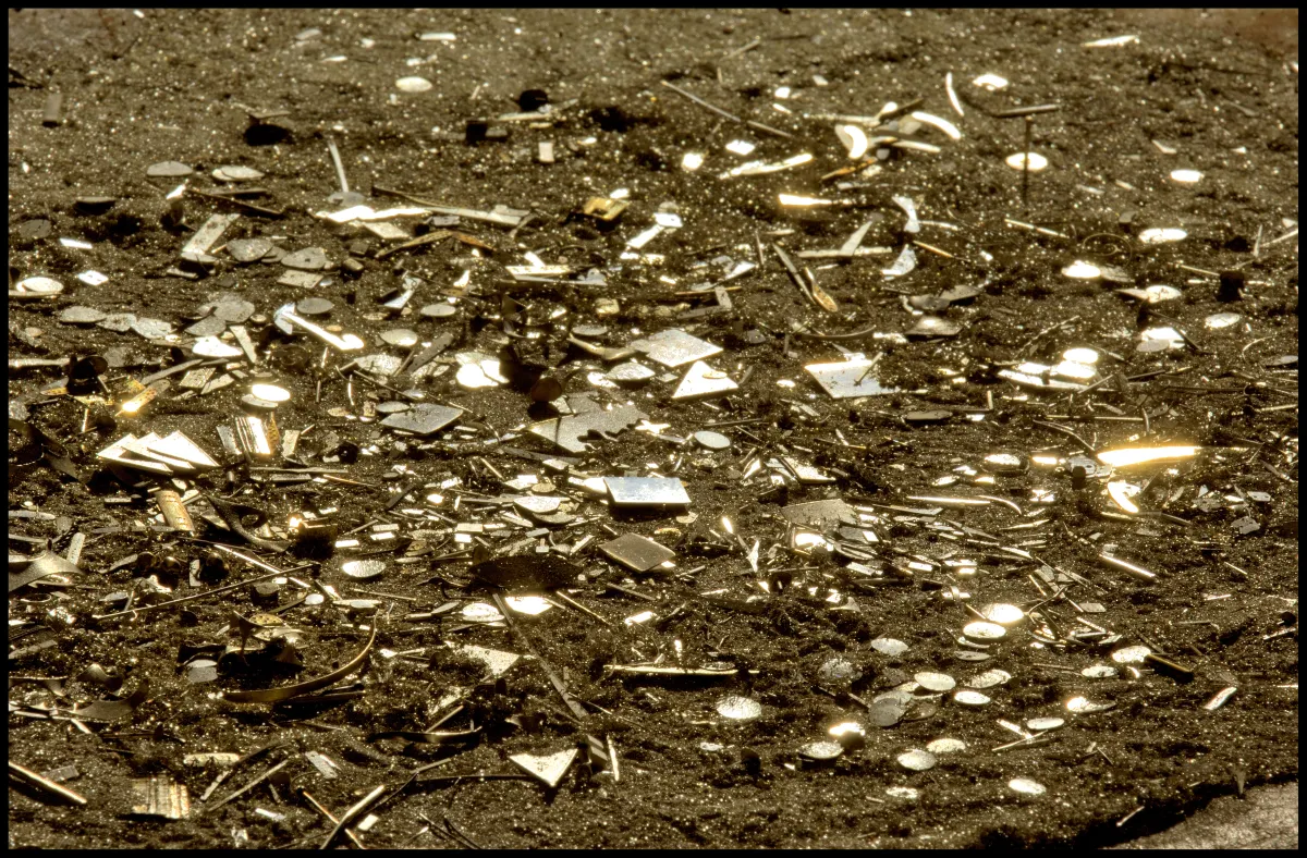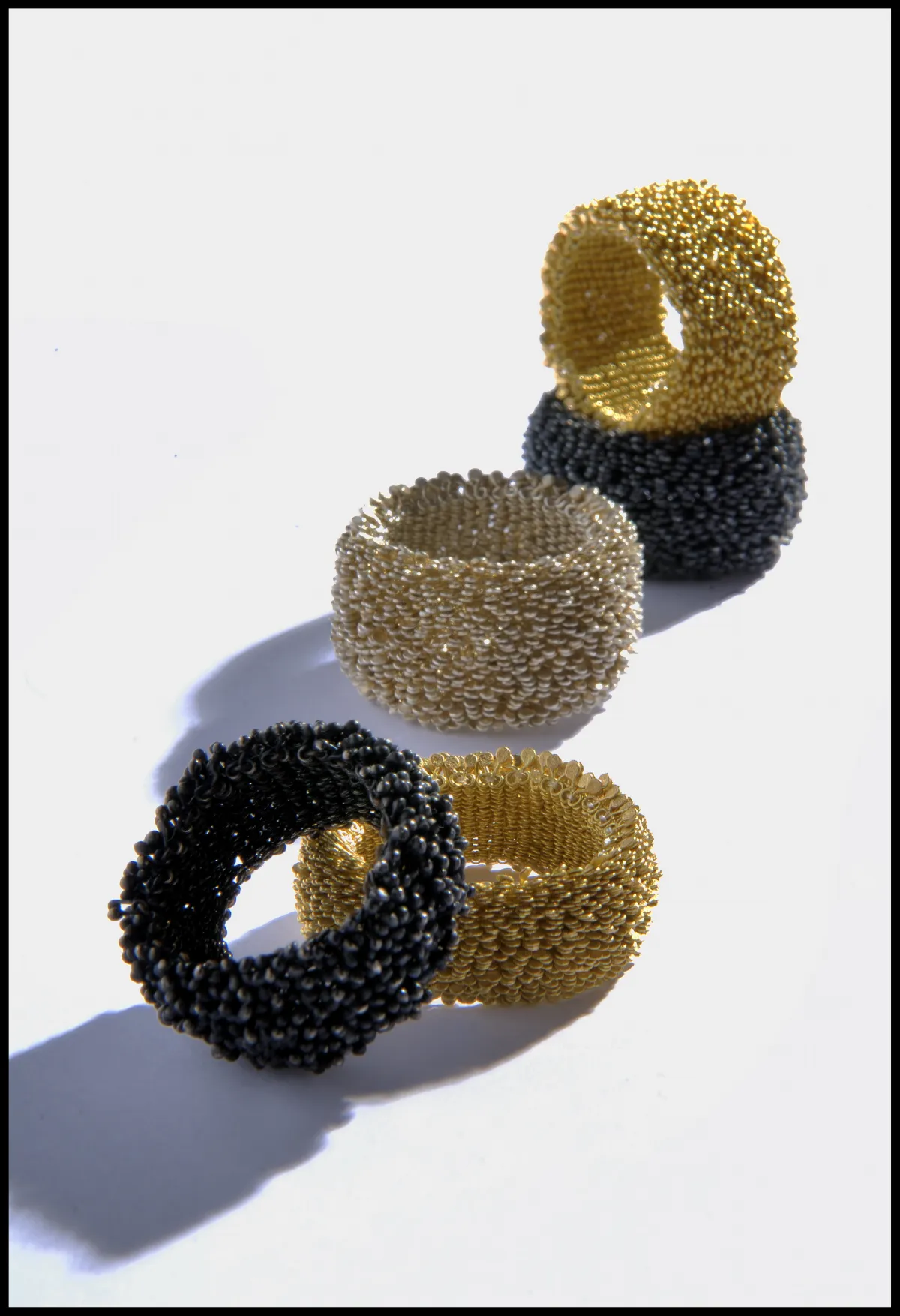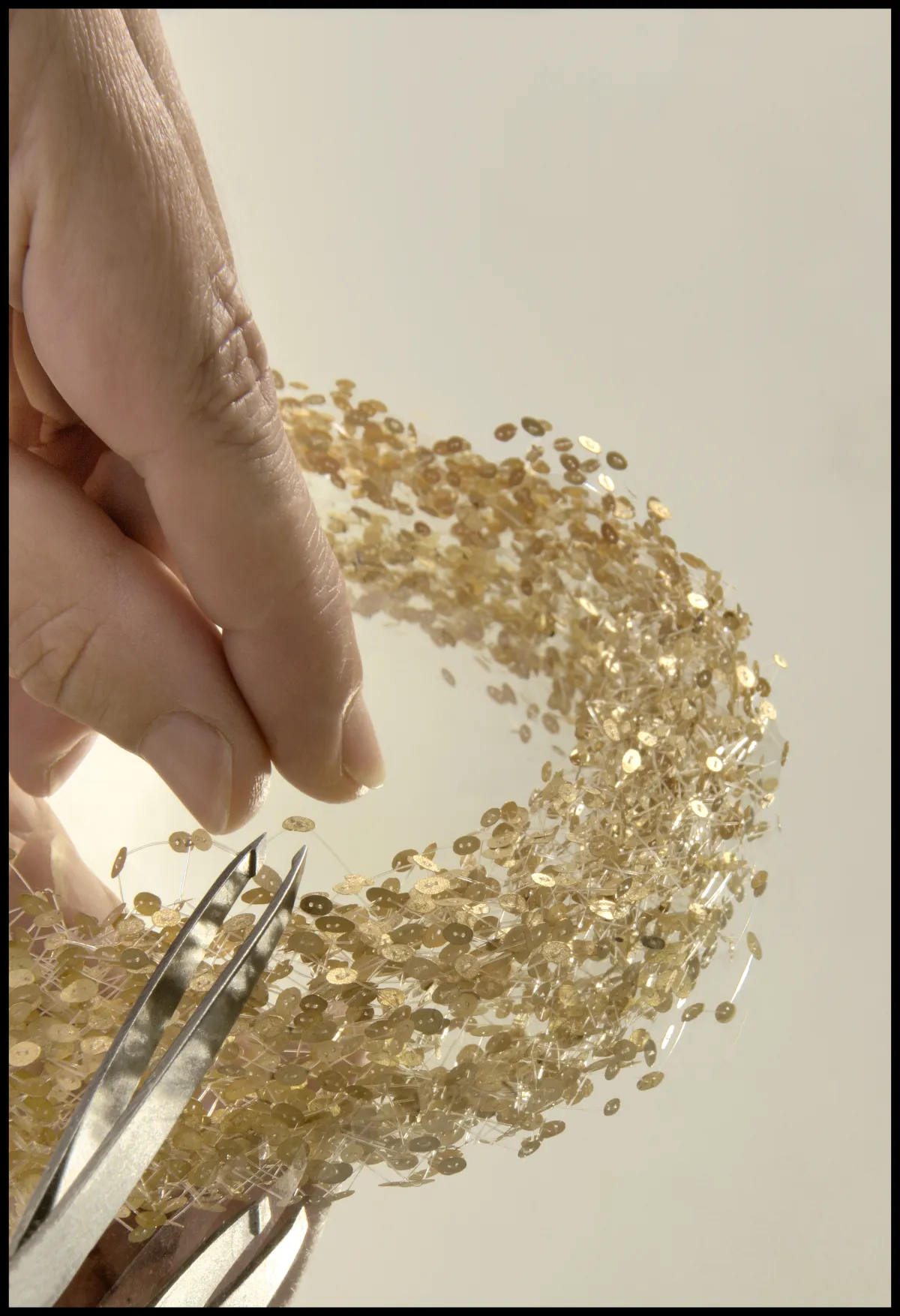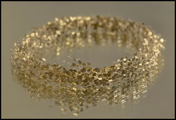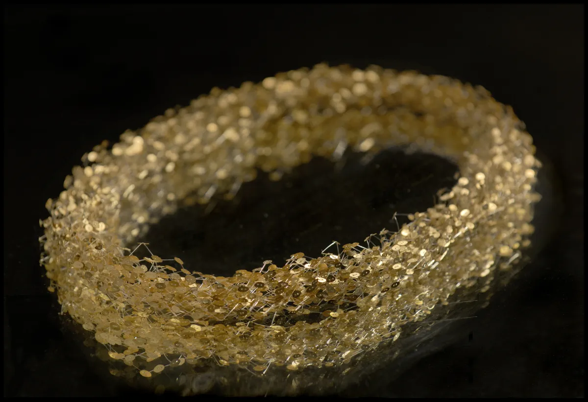 Pour réaliser cette pièce, la créatrice a divisé seize grammes d’or 750 en trois mille minuscules fragments. Ces délicates pastilles d’or martelées à la main ont été reliées entre elles par un tissage complexe de fils synthétiques invisibles. La myriade de granules d’or semble ainsi léviter et forme une voie lactée scintillante.