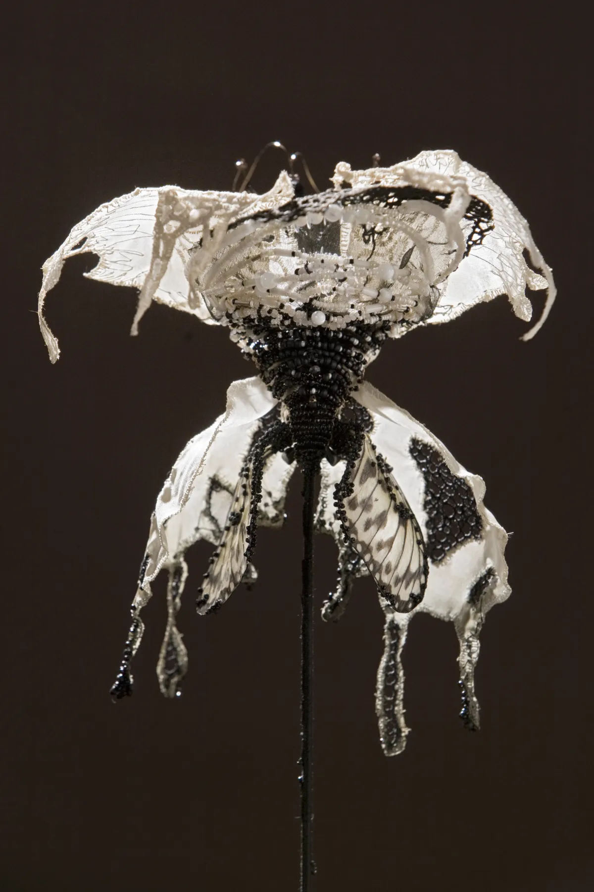 Phalaenopsis prend la forme d'une fleur fantasmagorique, évoquant dans le même temps les ailes d'un papillon, le tout entièrement réalisé à la main et brodé à l’aiguille. Les techniques et les matériaux utilisés sont multiples. Ils associent l’entrelacs des pétales de mousseline et de pongés de soie, les broderies aux points de feston et de bourdon, les perles de jais, les résilles de perles, les élytres de scarabée. L’entrecroisement de ces techniques et matériaux apporte transparence et graphisme, évoquant une dentelle vivante et délicate. Emmanuelle Dupont intègre dans ses sculptures textiles des dentelles aux motifs organiques et des éléments plus insolites.