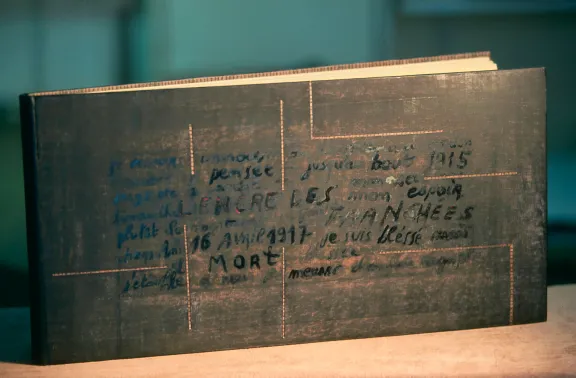 Bouleversé par la lecture de L’Encre des tranchées de Pierre Walusinski, un portfolio de sept lettres tirées du recueil Paroles de poilus et rehaussées d’un travail élaboré de typographie, Florent Rousseau a voulu en réaliser la reliure, comme un digne hommage à son texte poignant. Il s’agit alors pour lui de transmettre, par un langage décoratif, l’essentiel issu de sa propre lecture, à savoir la violence et l’émotion tout en suggérant l’atmosphère des tranchées. Pour lui, une reliure est réussie lorsqu’elle suggère déjà le contenu du livre.