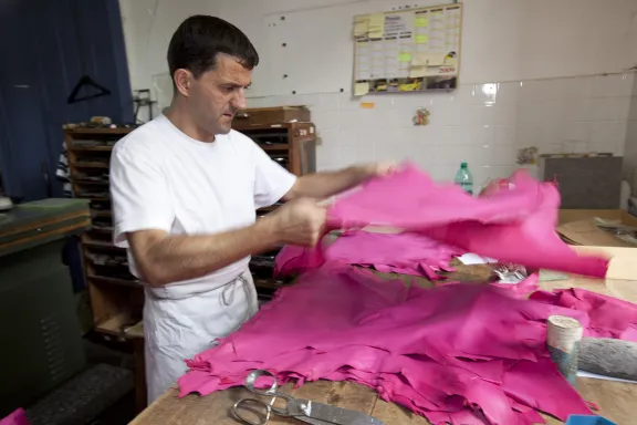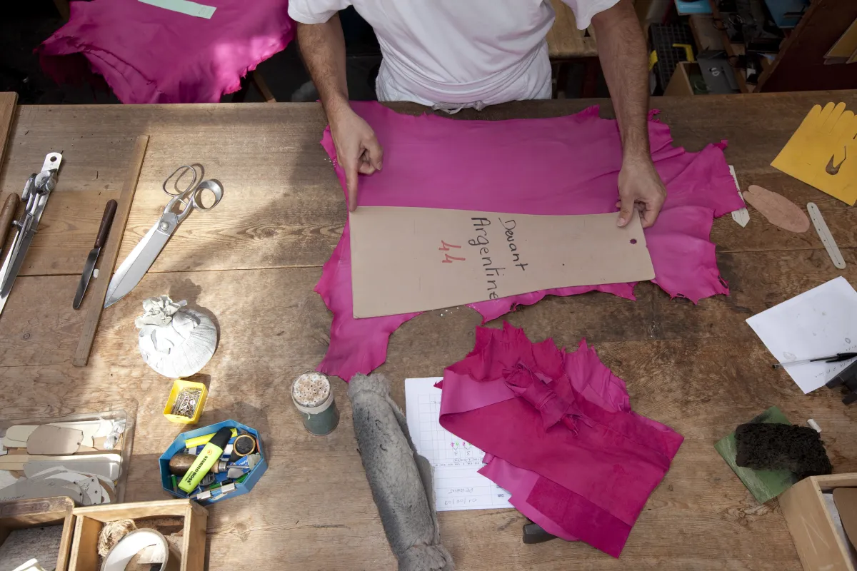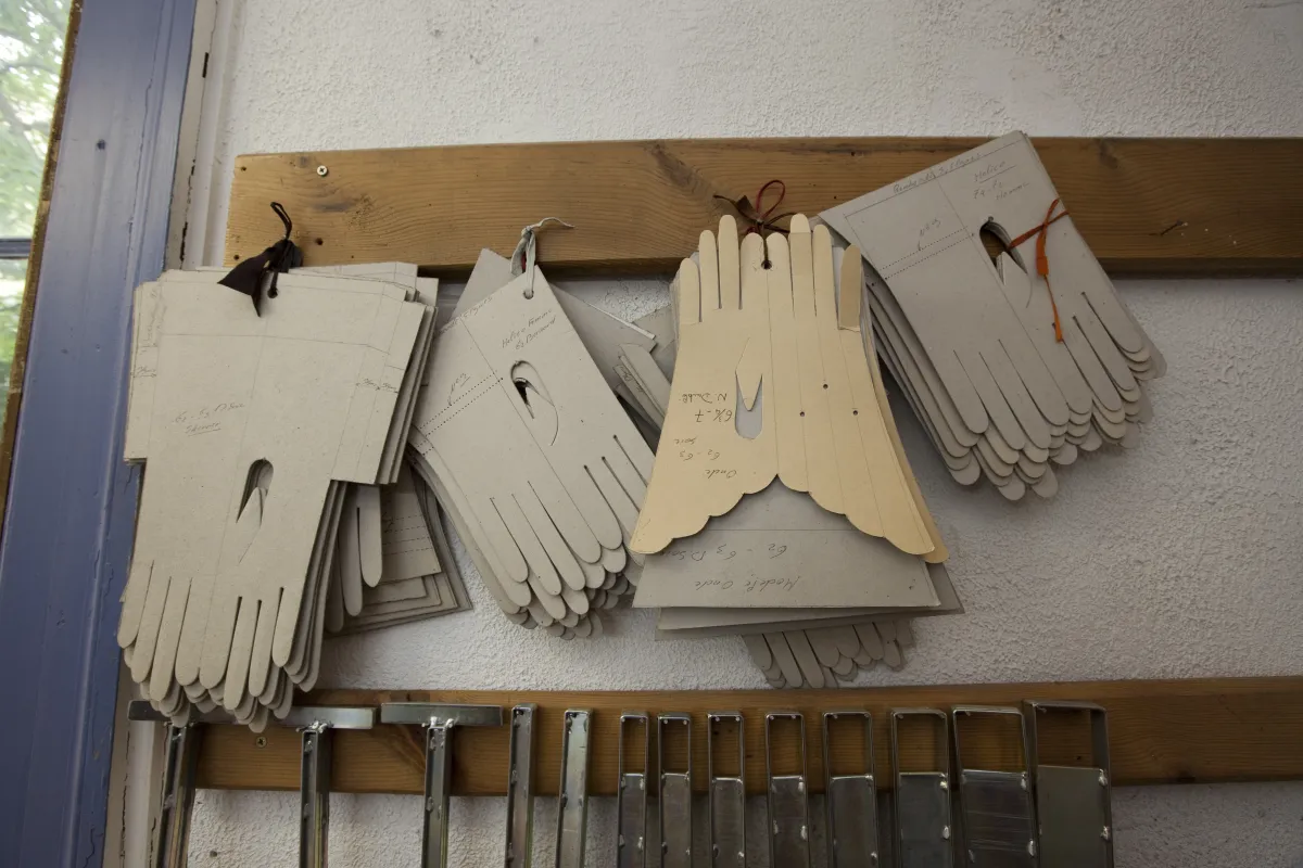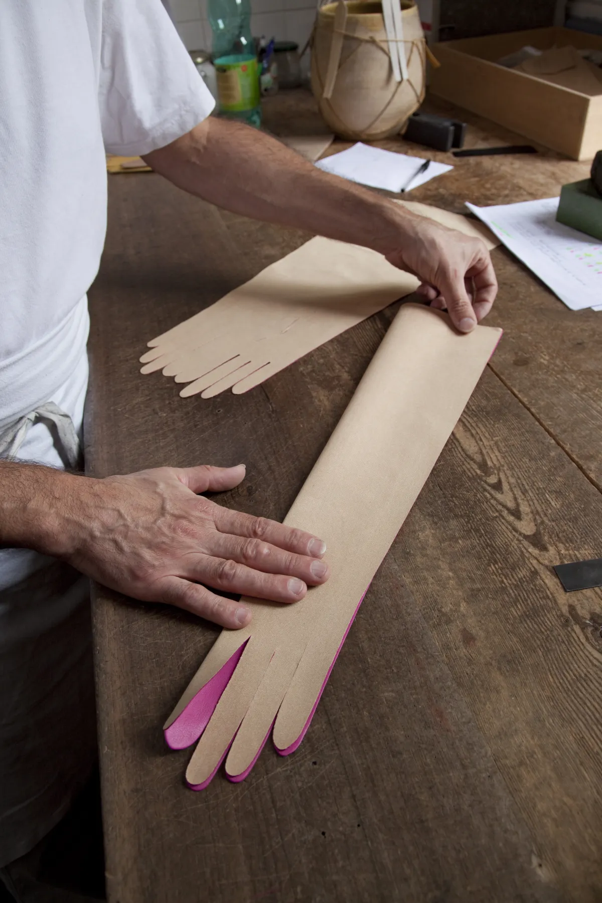 Jean-Marc Lavaur sélectionne les peaux fines et précieuses de chevreau, vison, chinchilla, crocodile et pécari selon leur taille, leur couleur et leur grain. Il prépare la matière, en suivant les techniques traditionnelles consistant à l’humidifier au tampon, la talquer et l’étirer. Il découpe ensuite la forme du gant avec un gabarit en carton avant de le retailler à l’emporte-pièce. La gantière Françoise Fabre décide de la coupe en fonction des contraintes et des techniques de la couture. Elle réalise les fantaisies et les motifs comme le surfilage, les nervures et les boutons à la machine et à la main.