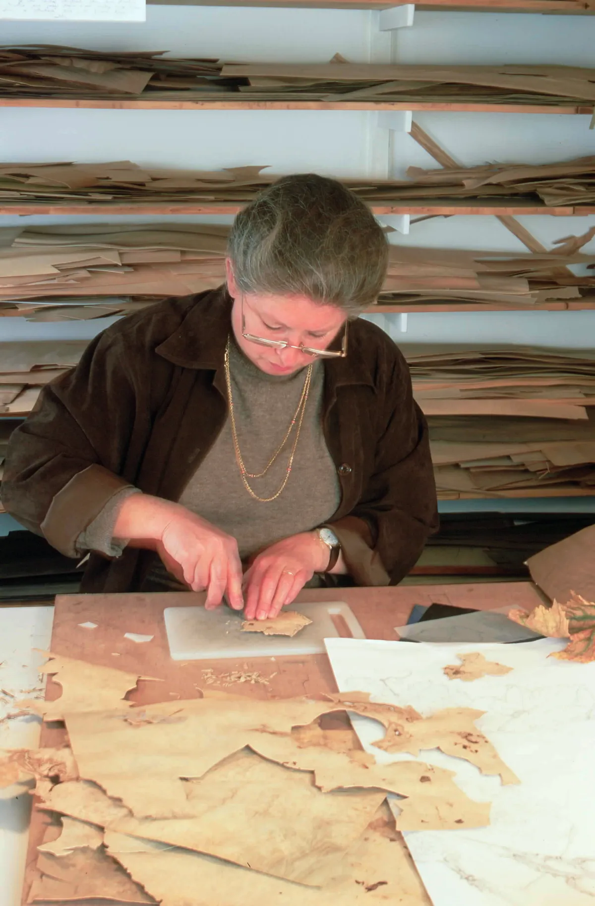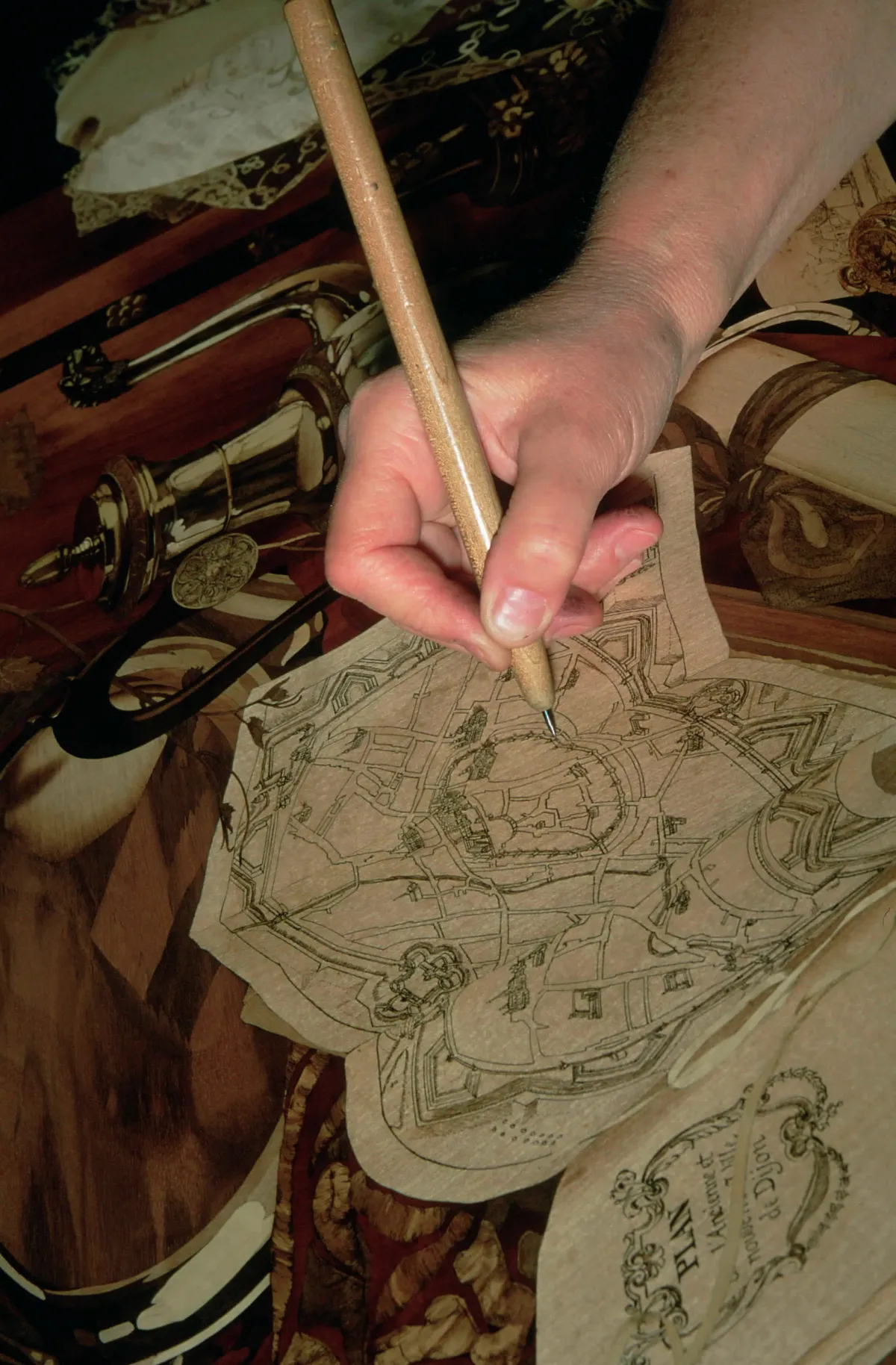 Pour cette réalisation, les artisans marqueteurs ont utilisé différentes essences de bois de sycomore, de noyer d’Amérique ou de palissandre, soigneusement choisis pour leur couleur et leur texture. Par le choix d’essences rares, la précision des découpes et des assemblages ainsi que par l’ombrage au sable brûlant et la gravure à la pointe sèche, Geoffroy et Armande de Bazelaire obtiennent un traitement réaliste des matières. Le métal, tour à tour mat ou brillant, le verre et ses jeux de transparence, les tissus, les végétaux, les minéraux, les porcelaines et les peaux animales offrent un rendu d'une netteté remarquable.