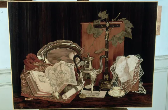 Réalisé pour un commanditaire privé, ce tableau plus vrai que nature, entièrement constitué de plaques de bois et de métal agencés, symbolise le parcours d’une famille bourguignonne. Sa composition a été élaborée à partir d’objets personnels choisis par la famille. Sur un tissu rouge brodé d’or et d’argent est ouvert un livre illustré d’un plan de la ville de Dijon. Au pied de la cafetière, une carte fait état de la propriété familiale. Le chiffre et les armes de la famille apparaissent sur une tasse et sur un mouchoir brodé. Le nom des enfants est gravé sur un cœur d’argent.