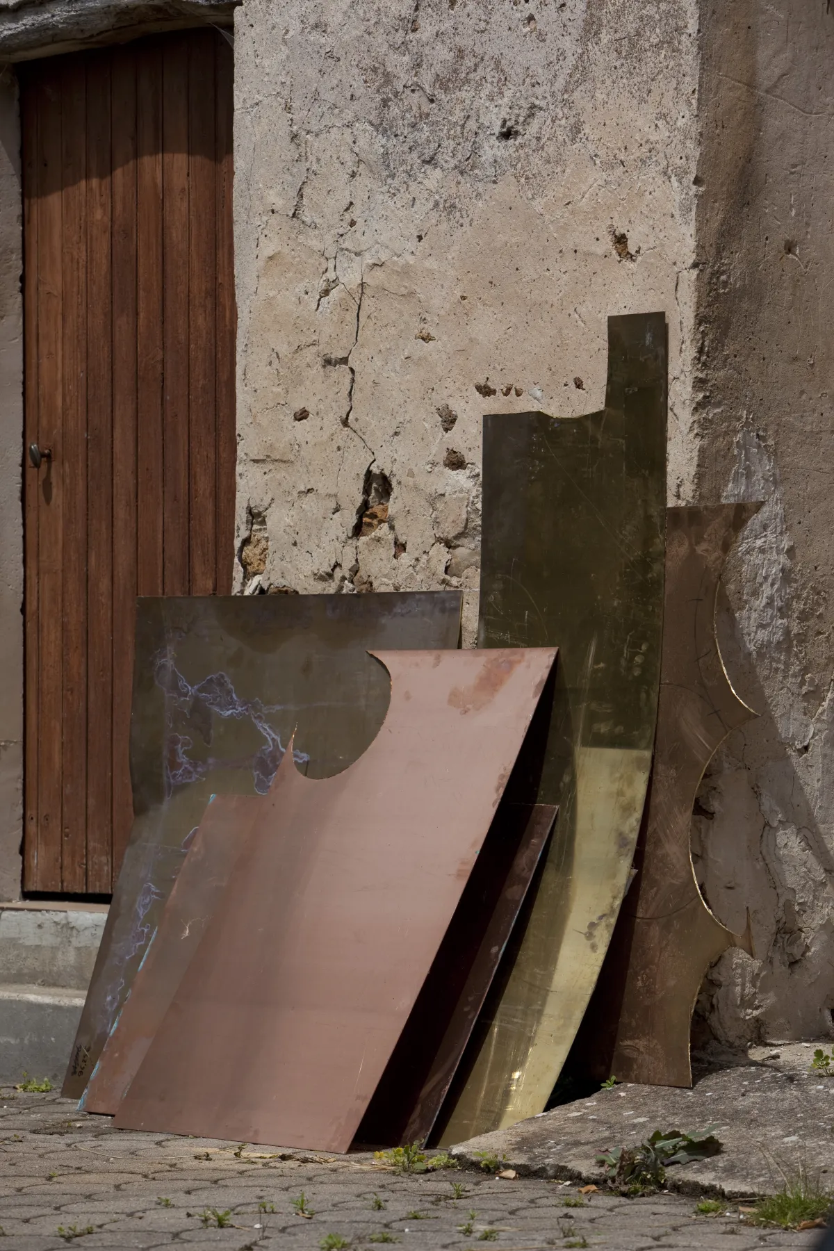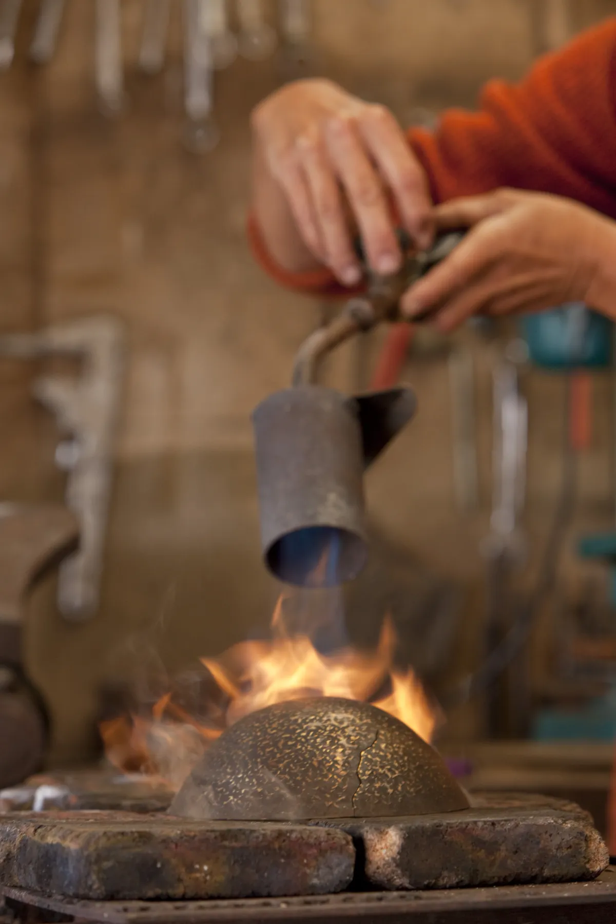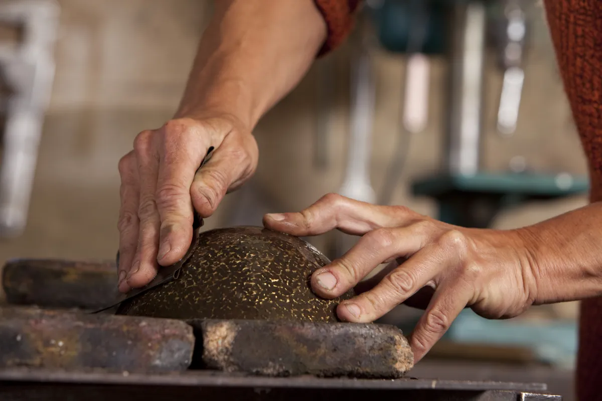 C’est armée de son marteau ou de son maillet de buis que la dinandière Gladys Liez dompte la matière jusqu’à épuisement. Spécialisée dans la technique de la rétreinte (passage de la feuille de l’horizontale à la verticale pour la refermer vers l’intérieur), elle redécouvre chaque jour « la magie de transformer une feuille » au fur et à mesure des recuits. En finition, Gladys Liez imprime sur la surface des pièces une texture particulière. Le décor déchiqueté de « Lichen » suggère une érosion naturelle.