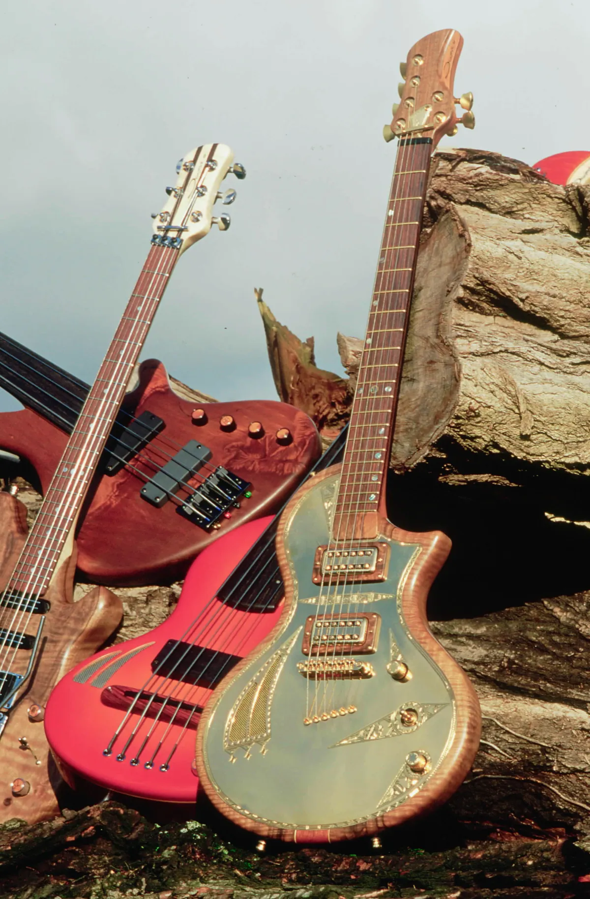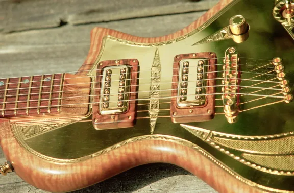 En l’exemple de cette guitare électrique en bois et en métal, Grégoire Damico élabore un modèle original de guitare mariant des bois acoustiques comme le noyer massif et l’acajou avec une table d'harmonie faite de laiton gravé, plaqué or. Le métal renforce les qualités du bois en augmentant la densité générale de l’instrument, en lui apportant une profondeur de son, pour une meilleure précision. À la grande liberté créative du luthier répond une précision scientifique à l’écoute de l’instrument.
