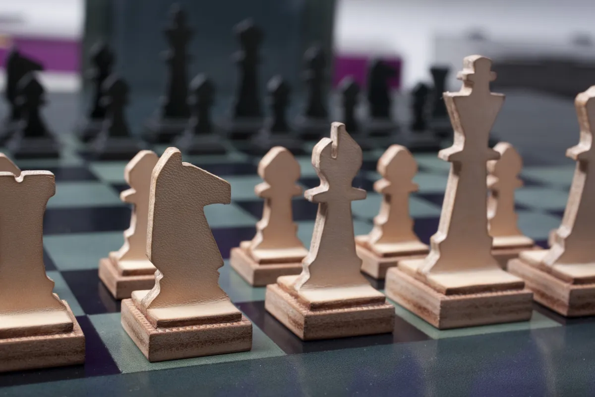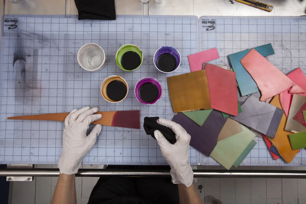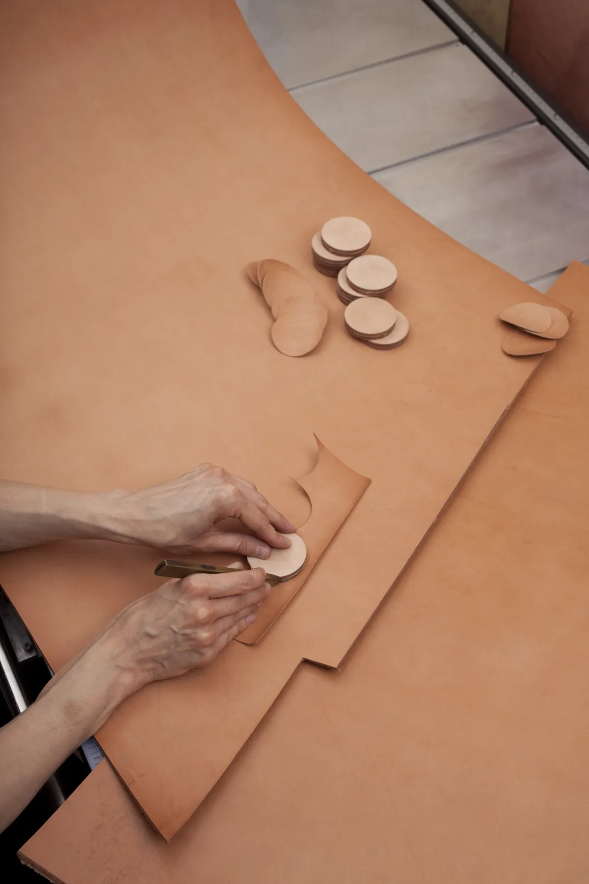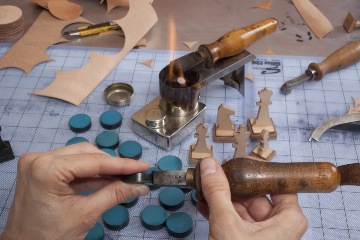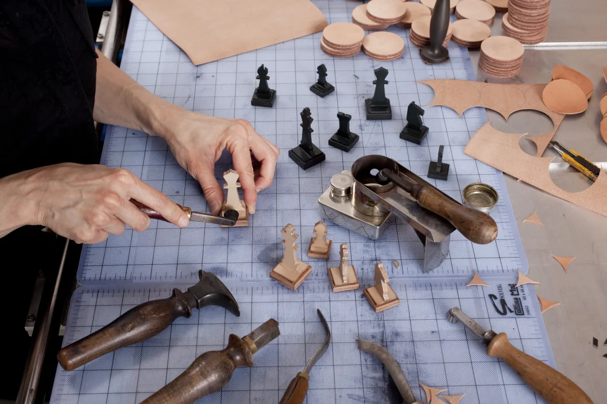 Fidèles à l’esprit de la botterie, leurs premiers objets décoratifs ont une structure semblable à une semelle de chaussure. L’épaisseur est obtenue par un assemblage successif de croupons de vache découpés à la main. Les figurines des jeux d’échecs sont réalisées, elles aussi, dans un cuir à semelle de chaussure teinté et patiné à la main. Leur innovation majeure réside dans l’invention d’un nouveau type de décor, la marqueterie de cuir en hommage à l’ébénisterie d’art du XVIIIe siècle