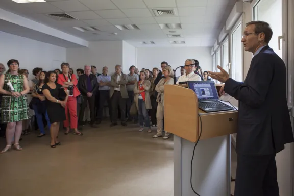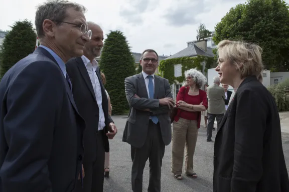 Jean-Antoine Girault, directeur de l'Institut du Fer à Moulin, Jean Chambaz, président de l'Université Pierre et Marie Curie, Thierry Damerval, Directeur général délégué de l'INSERM, et Florence Berthout, Conseillère régionale et Maire du Ve arrondissement, lors de l'inauguration de la plateforme d'élevage et phénotypage murin de l'Institut du Fer à Moulin, le 29 juin 2016. © inserm / Mehrak/Hans Lucas