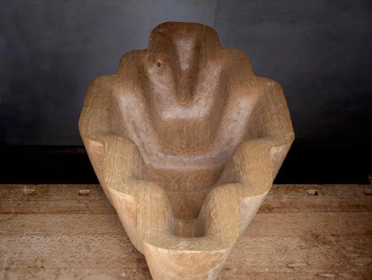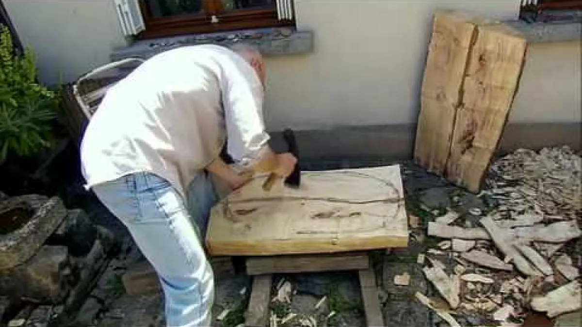 S’aidant de coins d’acier et d’une masse, Julian Schwarz a sculpté cette forme unique dans le bois massif fendu en deux dans le sens de la longueur. De son utilisation méthodique et puissante des grandes scies, haches, herminettes, ciseaux et gouges, il y a dégagé une pièce de bois monolithique, laissée dans son aspect brut en conservant en surface les traces des outils.