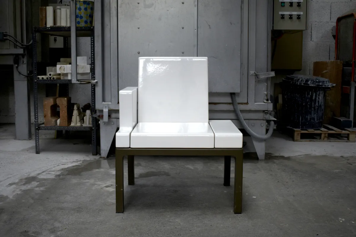Le fauteuil est constitué d’une structure métallique peinte et d’une assise en céramique, composée de deux coussins, d’un accoudoir et d’un dossier. Les coussins, généreux et épais, confèrent à l’objet confort et sophistication. La finition de la céramique émaillée, lisse ou texturée, apporte une brillance et une profondeur enrichie par le travail en relief du motif inspiré de la culture libanaise traditionnelle et de son rapport à l’ornement et au décor.