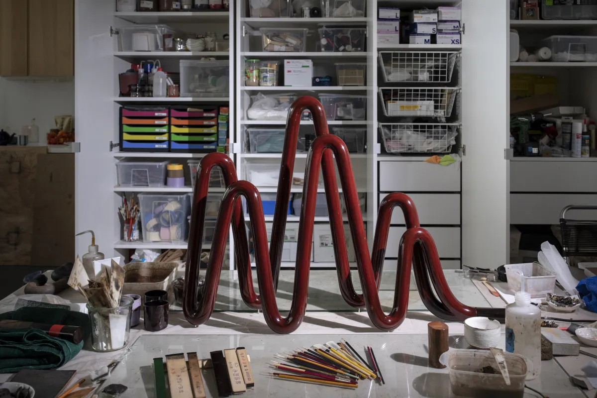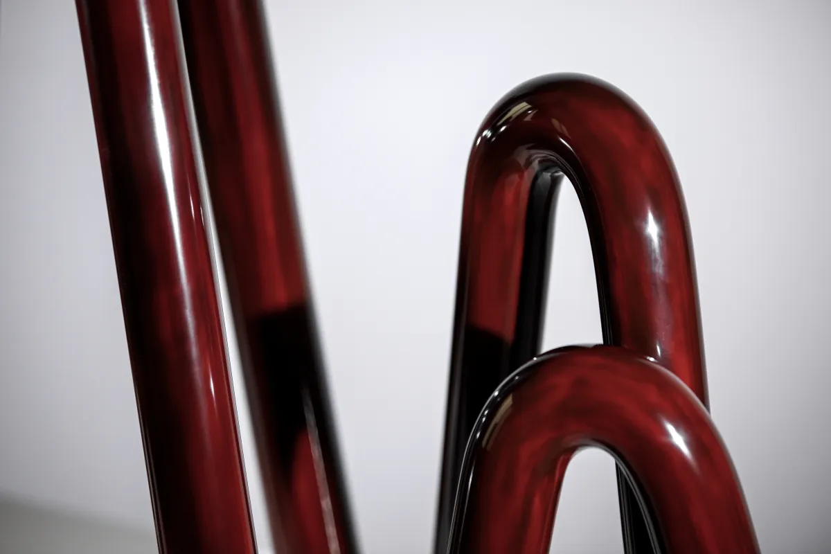 Référence au principe physique qui lie chaleur et température, cet objet dessiné d’un seul trait n’est autre qu’un radiateur d’intérieur pensé comme un chauffage d’appoint mobile. Petit chef d’œuvre d’esthétique autant que d’innovation, Entropie est surtout la parfaite synthèse des savoir-faire de ce duo, illustrant la force et la qualité d’un cheminement intellectuel commun. Le point de départ de la réflexion a été, ici, les propriétés de la laque végétale d’origine japonaise utilisée par Nicolas : « Largement employée dans les arts de la table, celle-ci peut être chauffée jusqu’à 200°C. Le défi a été d’exploiter ses caractéristiques en lui ouvrant de nouveaux horizons ».