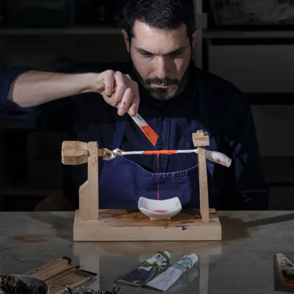 Après avoir obtenu en 2001 son diplôme des métiers d’art en ébénisterie à l’École Boulle, Nicolas Pinon se consacre aux techniques de finitions traditionnelles et contemporaines. Il commence à se passionner pour la laque japonaise au détour d’une conférence et décide de partir en 2003 à Barcelone,à l’EPSAR (Escuela Profesional Superior de Arte y Restauración), pour se former aux techniques de cette matière. Pour parfaire son savoir, il se rend à plusieurs reprises au Japon auprès des plus grands maîtres laqueurs. Devenu laqueur décorateur indépendant en 2008, Nicolas Pinon collabore à de nombreux projets notamment avec Jacques Garcia et Joseph Karam. Depuis 2013, il se consacre exclusivement à la laque japonaise et partage son activité entre la restauration et la création de bijoux ou de mobilier.