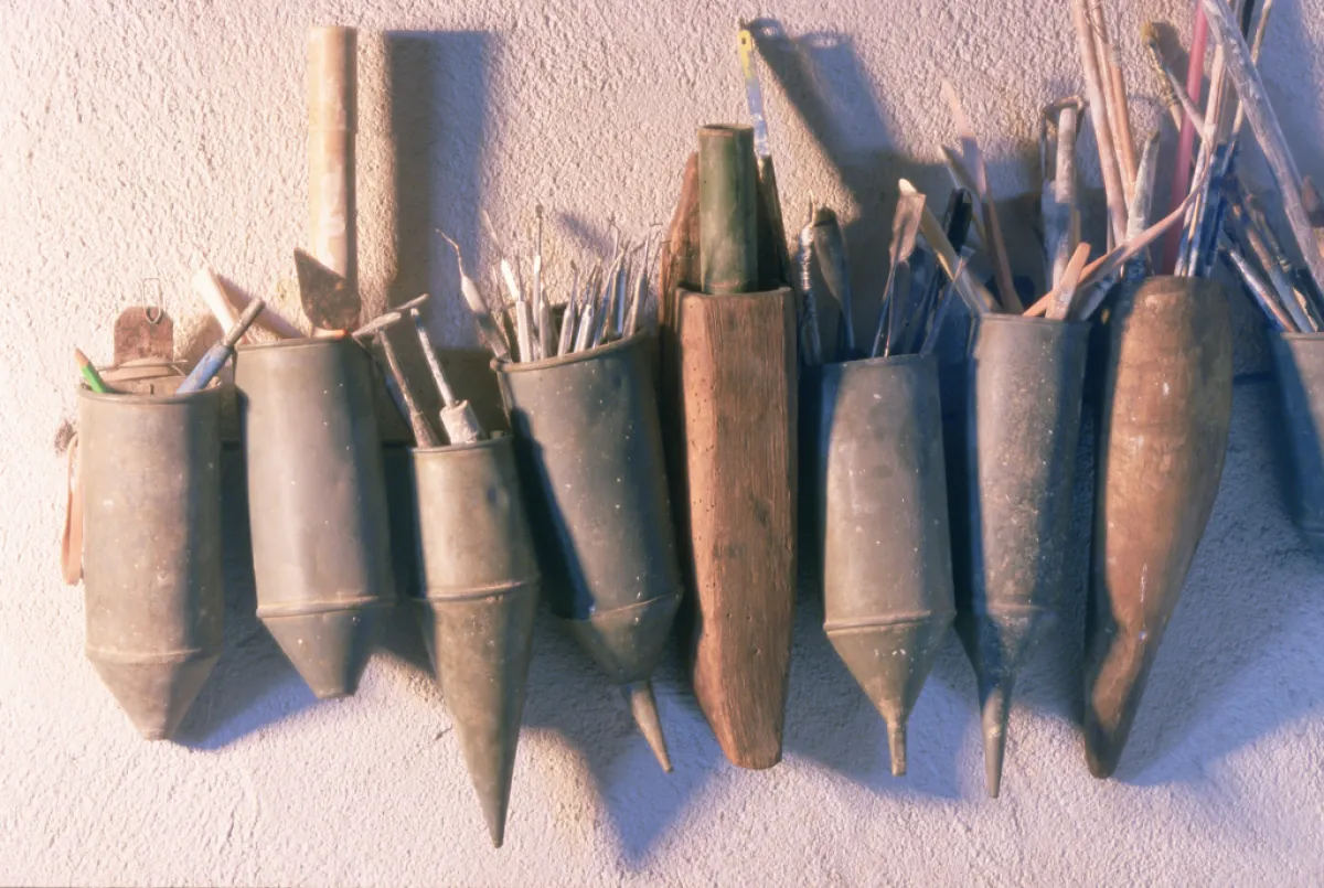 Issue d’une terre de brique, à l’instar de celle que tournaient les potiers grecs des premiers temps dont Pierre Bayle adopte les techniques antiques, Gaea est une terre cuite engobée. L’engobe consiste en une barbotine très légère, cuite à mille degrés, faisant corps avec le support qu’elle recouvre. L’argile très fine utilisée par l’artisan est tournée, lissée, polie et révèle des teintes de bruns et de gris noirs.