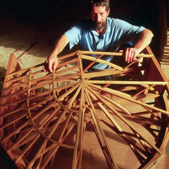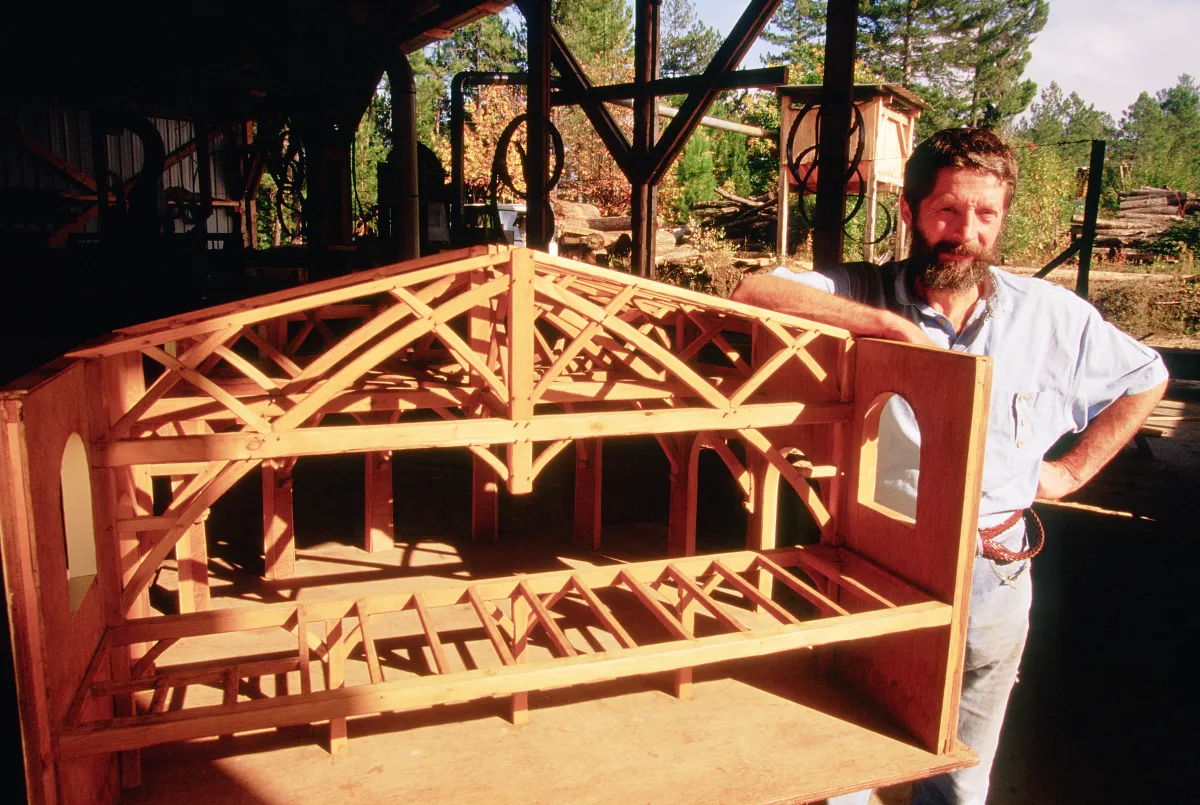 Pour parvenir à cette véritable architecture de bois, le charpentier de talent ne laisse rien au hasard : il en maîtrise toutes les étapes de conception, de la sélection de l’arbre en forêt à son équarrissage avant de passer aux phases de sciage, de rabotage, de levage et d’assemblage, opérées avec la plus grande précision. Pour ces deux charpentes primées, Roger Ménétrier s’est fondé sur une maquette au 1/10e, dont il a accentué l'impression d'élévation par l'utilisation répétitive de pièces courbes naturelles.
