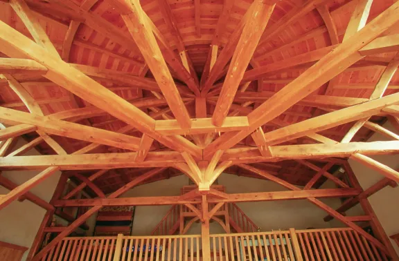 Grâce à sa fine connaissance du bois et des forêts, mais également un savoir-faire technique hors-paire, Roger Ménétrier parvient à concevoir des charpentes telles des sculptures monumentales, en l’exemple de la charpente du Clos d’Aguzon.