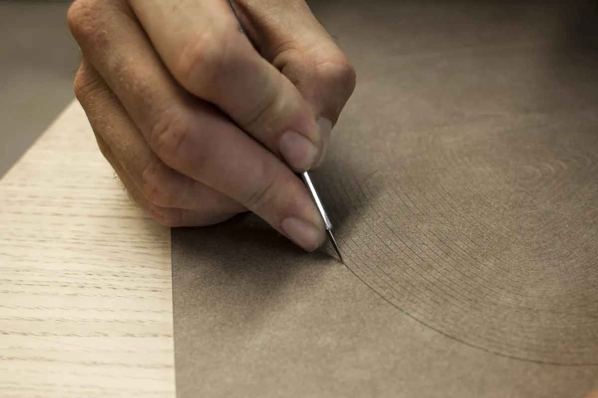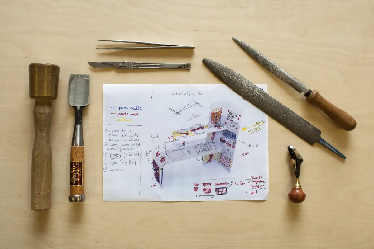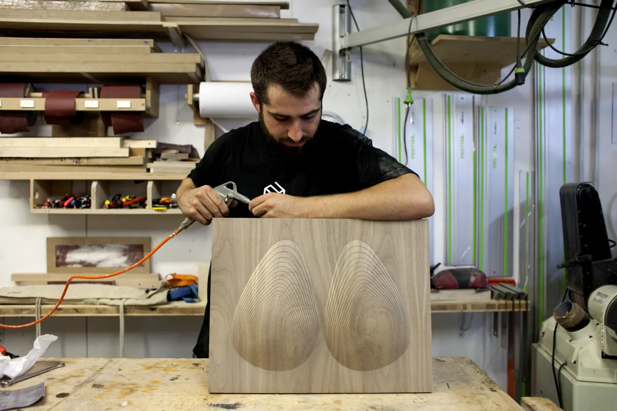 Cette technologie novatrice, baptisée « Woowood », reprend le savoir-faire traditionnel de la « repousse » utilisé pour restaurer les marqueteries anciennes. L’artisan d’art a fait évoluer la technique, mais l’a surtout appliquée à des objets contemporains : cutter numérique, colle high-tech mise au point avec un ingénieur pour faire tampon entre le bois et le caoutchouc… Le résultat porte un message fort : le futur ne s’écrit que par une intime connaissance des gestes et des savoir-faire du passé.