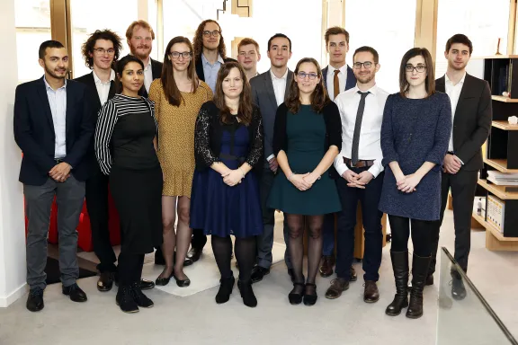 Avec de gauche à droite : Pierre Klein, Pierre Ronceray, Caroline Midonet, Fabien Vinckier, Charlotte Viant, Thomas Chaigne, Pauline Jeannot, Sebastian Lequime, Regis Joulia, Cécile Alanio, Jean-Baptiste Cavin, Kevin Fidelin, Alexandra Vaccaro et Vincent Libis. © Caroline Doutre/CAPA Pictures pour la Fondation Bettencourt Schueller