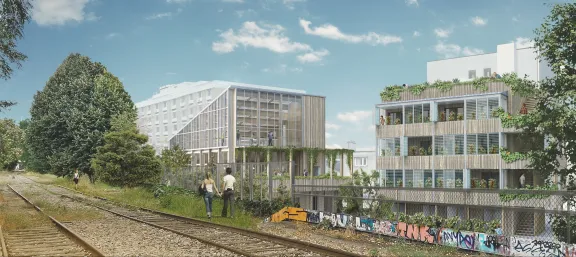 La Ferme du Rail propose d'héberger, de former et de réinsérer vers des emplois durables des personnes en grande précarité, dans un espace ouvert au quartier et dédié à l'agriculture urbaine dans le 19e arrondissement de Paris. Le projet comprend la construction d’un Centre d’hébergement et de réinsertion sociale de 15 logements, d'une résidence sociale étudiante de cinq logements, d'une serre de production abritant également un restaurant ouvert au public, de locaux d’activité agricole d'insertion et d'espaces aménagés pour de la production maraîchère. L’association Travail & Vie déploie au sein de ce nouvel espace une activité agricole et des services associés servant de support à des emplois d’insertion. Cette activité est destinée à des personnes en grande précarité, hébergées sur place ou qui seront adressées par des associations partenaires.