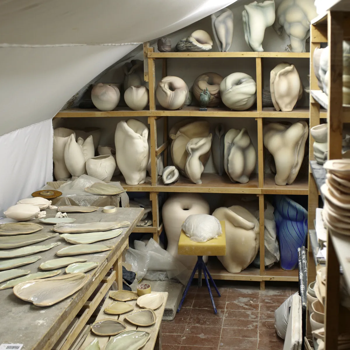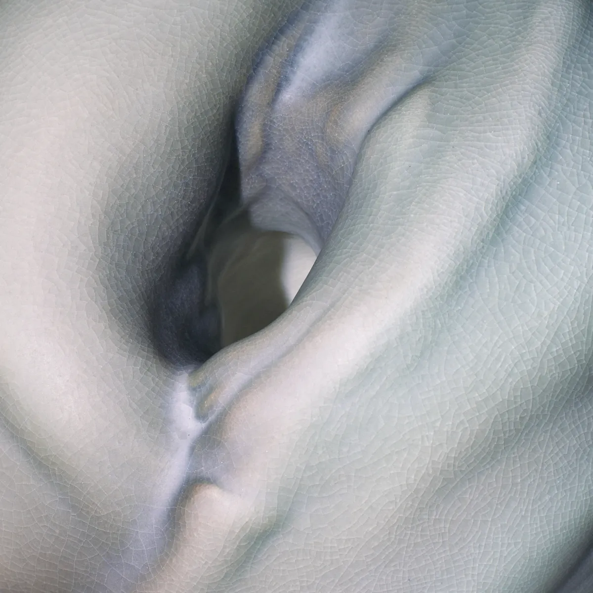 La pièce travaillée en grand format a été tournée en trois parties et en double paroi, deux formant l’extérieur et la troisième l’intérieur. Façonnées sur des formes souples, les plaques d'argile ont été assemblées en volume par des raccords expressifs, évoquant le corps humain. Le modelé des creux et des bosses est appuyé par des projections à l’aérographe de fines couches d’émail traitées en dégradés irisés. Après cuisson, un sablage et un ponçage minutieux ont permis de rendre une glaçure texturée à l’aspect craquelé, entre matité et transparence.
