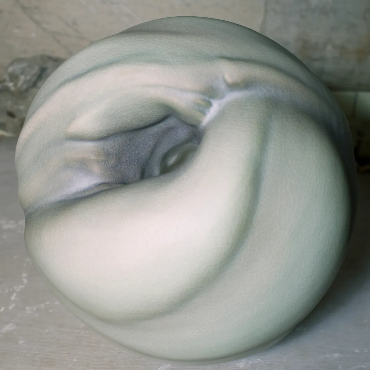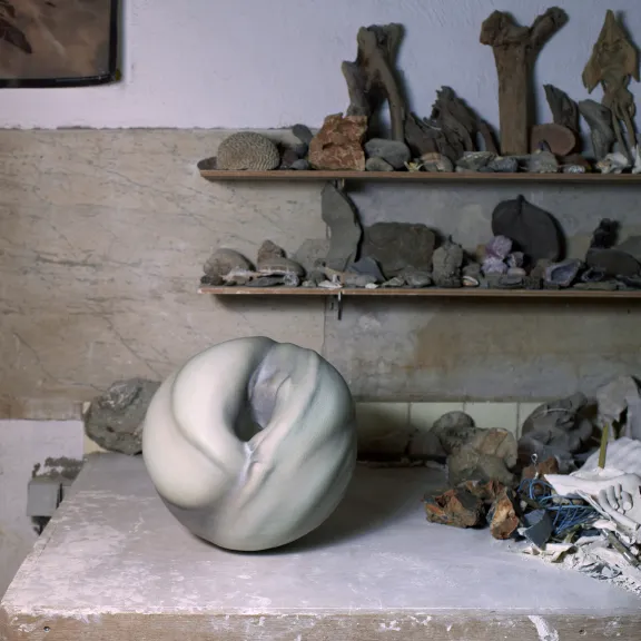 A la fois sculptures et contenants biomorphiques, abstraites et figuratives, les formes que façonne Wayne Fischer évoquent des matrices hybrides entre le végétal et l’anthropomorphe. C’est justement le cas de Métamorphose, une sphère de porcelaine qui en appelle aux sens, imitant à la perfection la sensualité et les nuances de la peau humaine. Elle se déploie comme l’ébauche d’un corps criant de vérité, au trou béant suggérant une intériorité chère à l’artisan-potier.