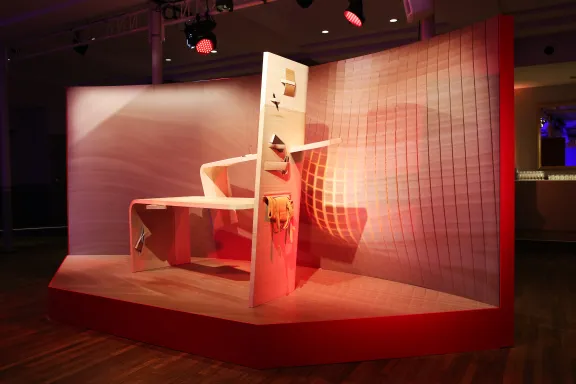« Un objet manifeste… », c’est ainsi que Steven Léprizé aime à définir son Bureau Marsupio dont la forme évolue en continu selon les besoins de son utilisateur. Meuble fonctionnel et sculpture à la fois, cette pièce a nécessité des années de gestation et de mise au point. Elle met en application une technique innovante qui consiste à coller du bois sur un autre matériau – du caoutchouc en l’occurrence – afin d’exploiter les propriétés de ce dernier. Cette association d’une grande souplesse donne au meuble des airs de drapé mouvant, aux formes sans cesses réinventées selon les contenants qu’il accueille dans ses poches multiples.