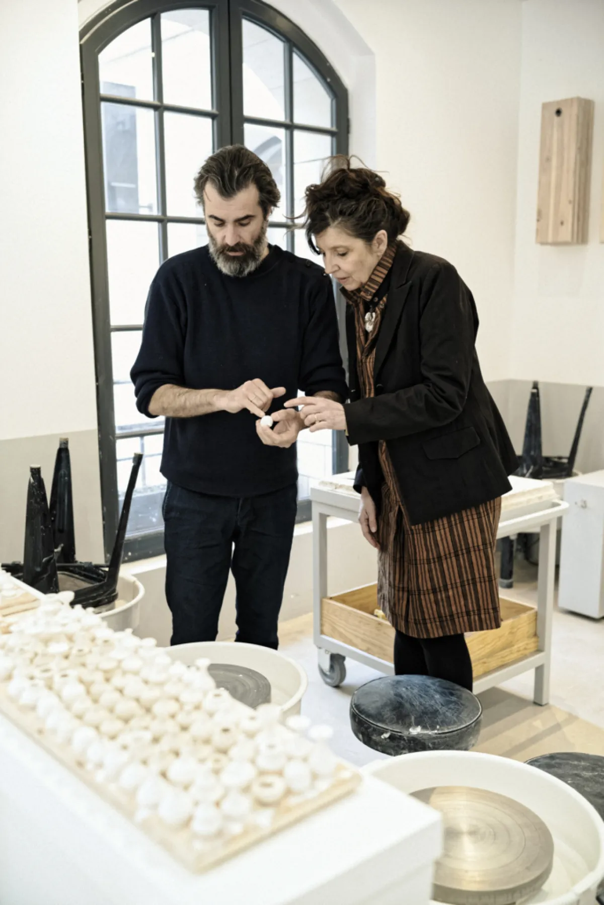 Figure atypique du paysage contemporain, Grégoire Scalabre repousse sans cesse les limites de la céramique. L’artiste défie la matière pour offrir un répertoire de formes constamment renouvelé : du registre de la dissémination et de l’accumulation, à celui du dynamisme et du monumental, en passant par l’architecture et la métallurgie. En 2022, convaincu que sa pratique d’enseignement nourrit sa pratique artistique et réciproquement, il fonde SCALABRE ET MERCIER en collaboration avec Virginie Mercier, un atelier de transmission du savoir-faire et de la technique de céramique.