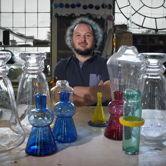 Le romancier Yannick Haenel a rencontré le maitre verrier Yann Grienenberger, directeur du Centre international d'art verrier de Meisenthal.